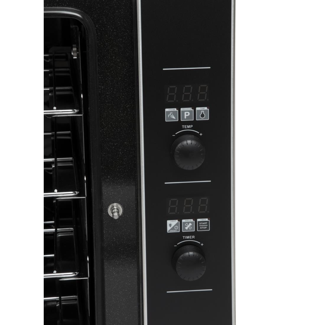 The ultimate stainless steel Blue Seal convection oven boasts state-of-the-art features, including digital display time and temperature controls, with up to 20 programs to choose from. It is portable enough to be used anywhere, making it possible to cook and bake for every need. The water injection feature delivers excellent results when moisture or steam is required, while the bi-directional reversing fan enhances the efficiency and evenness of heating. The side-hinged, low-temperature safe-touch door is equipped with a cool-touch handle and an easy-to-clean plug-in door for added appeal.