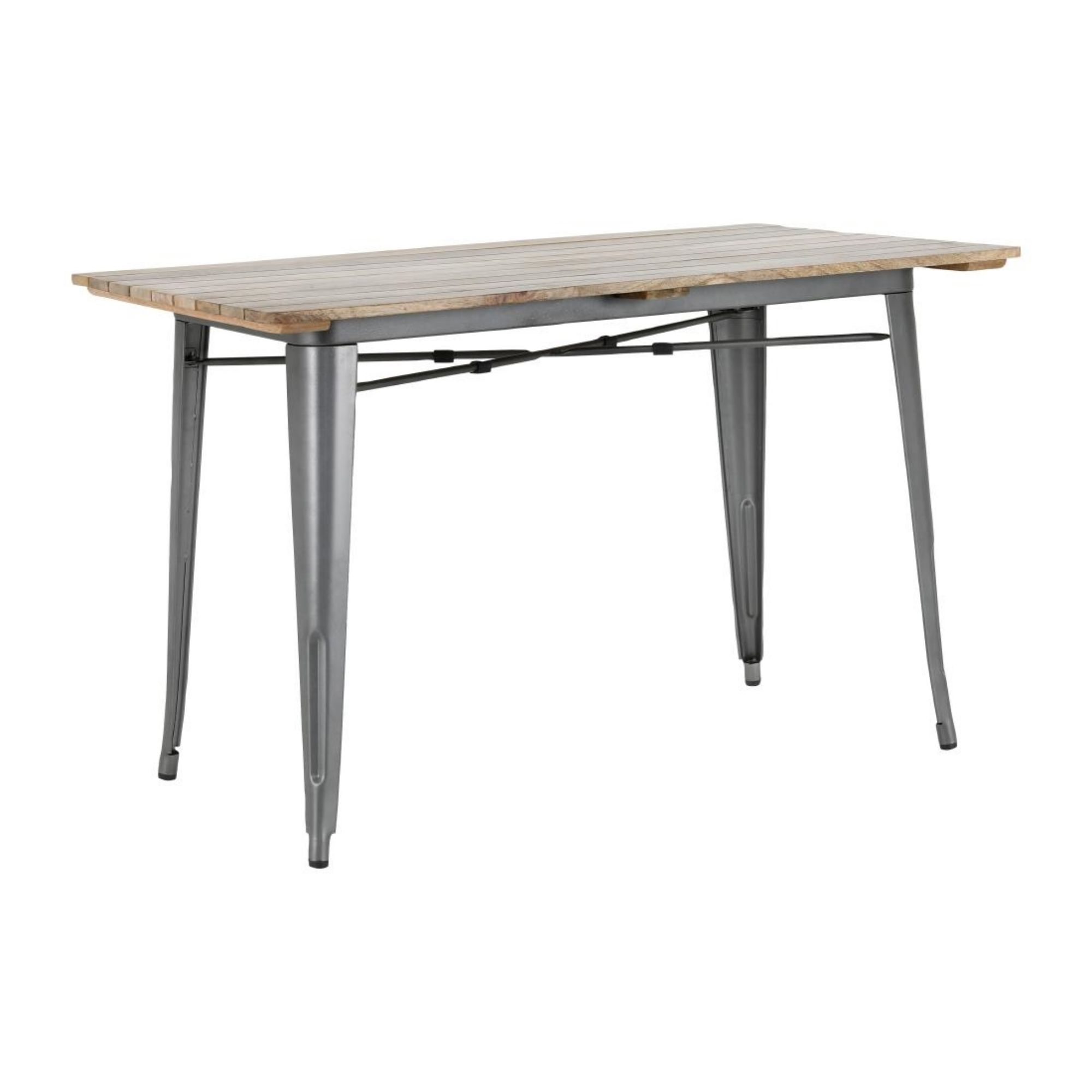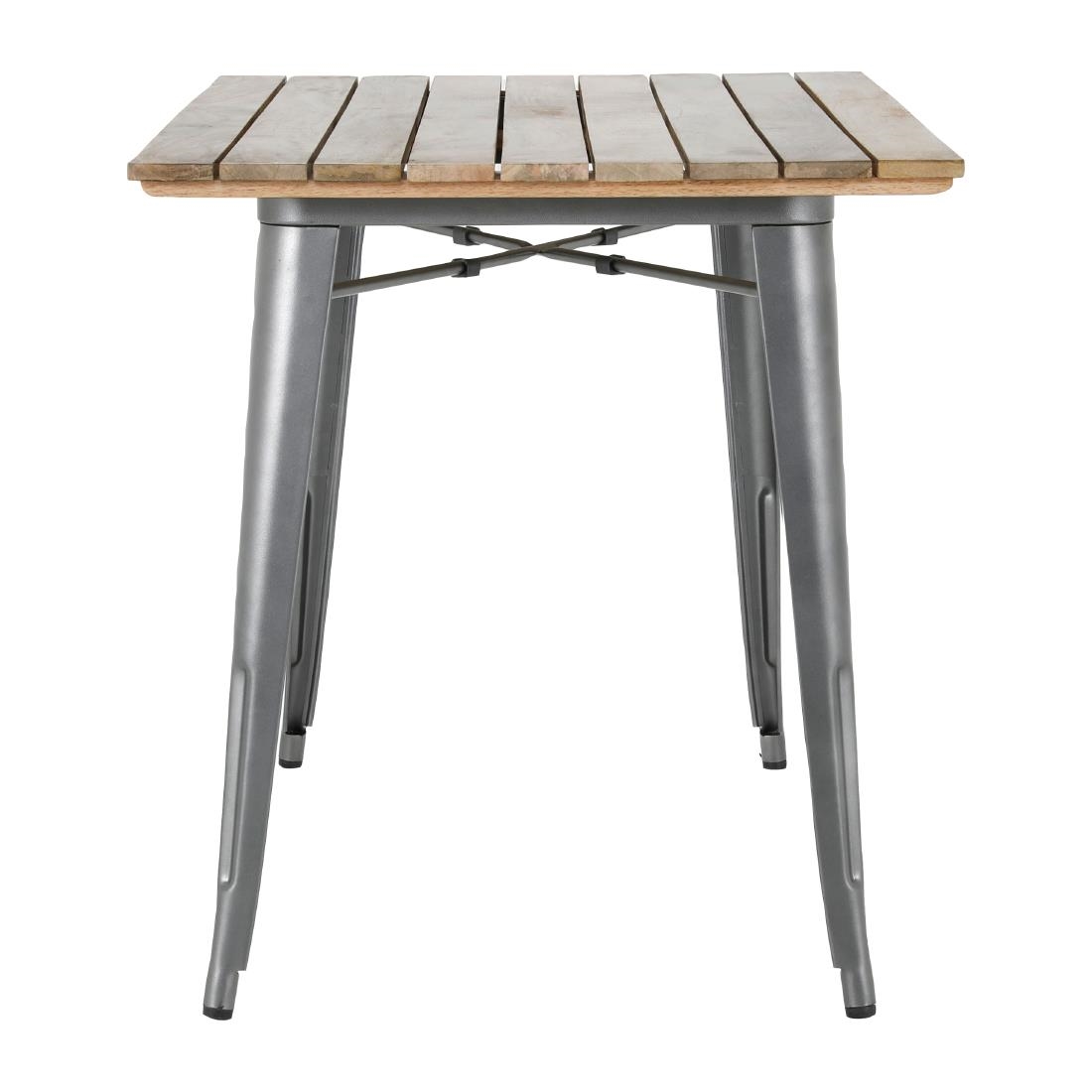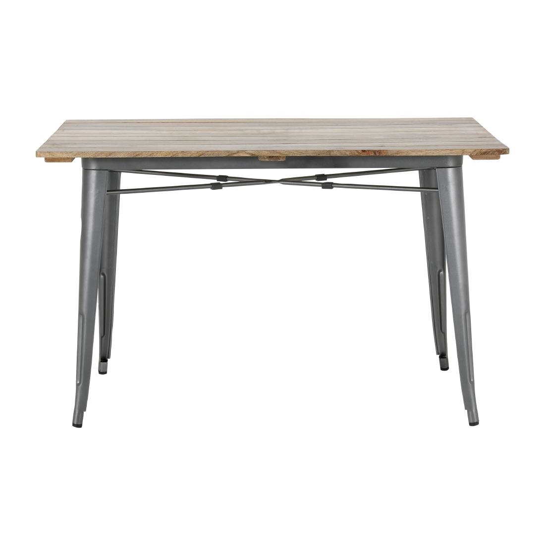 Built with a gunmetal powder-coated steel frame that's scratch and corrosion-resistant, the table is made to withstand the demands of busy service. Its slatted mango wood top adds natural warmth and contrast to the urban edge of the frame, while the 1200 x 700mm size comfortably seats up to four guests.