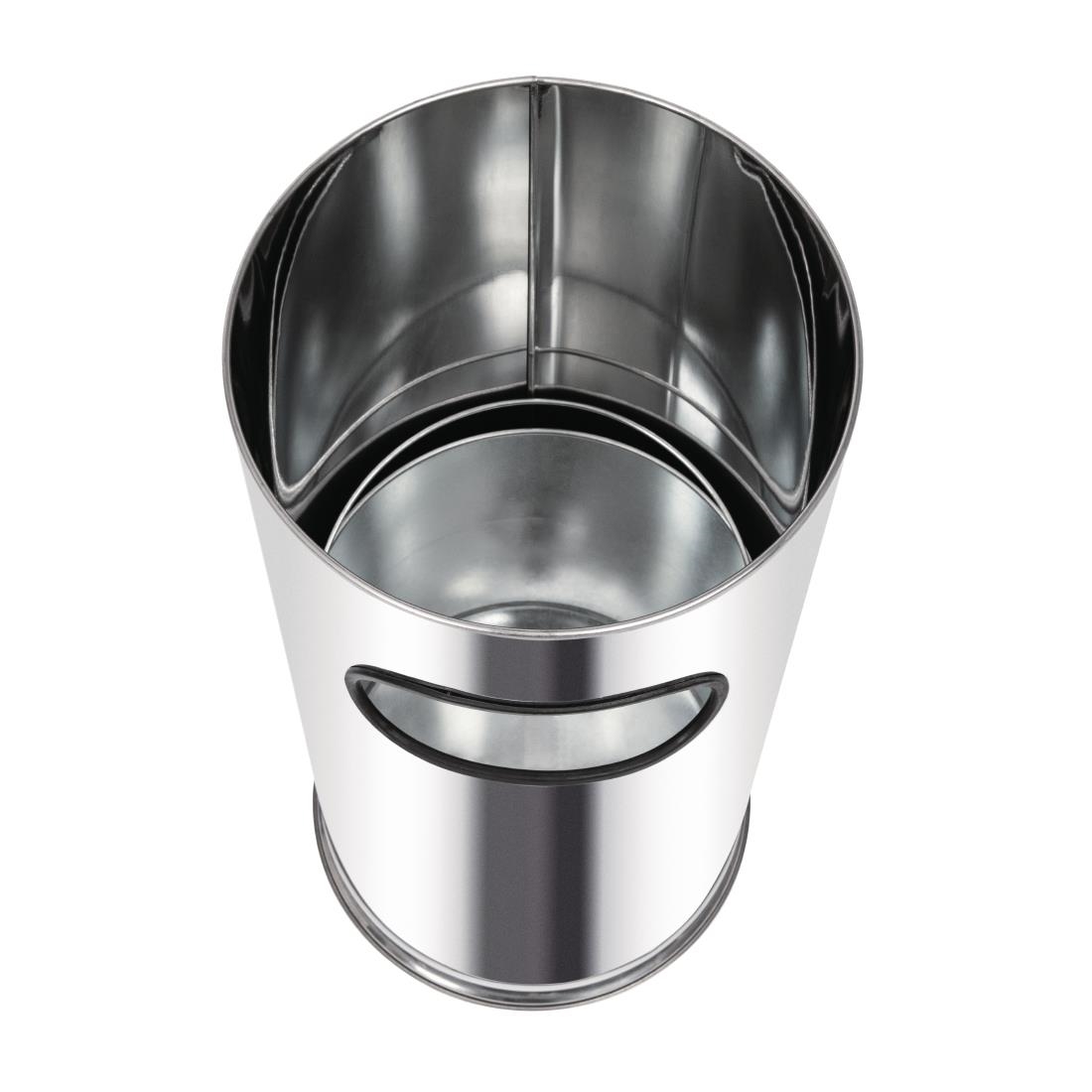 The Bolero cigarette bin features a stylish mirror-finished 18/0 stainless steel design, offering both functionality and a sleek appearance. It includes a separate removable ashtray on top for easy maintenance. This product is available in two different sizes to suit various needs.