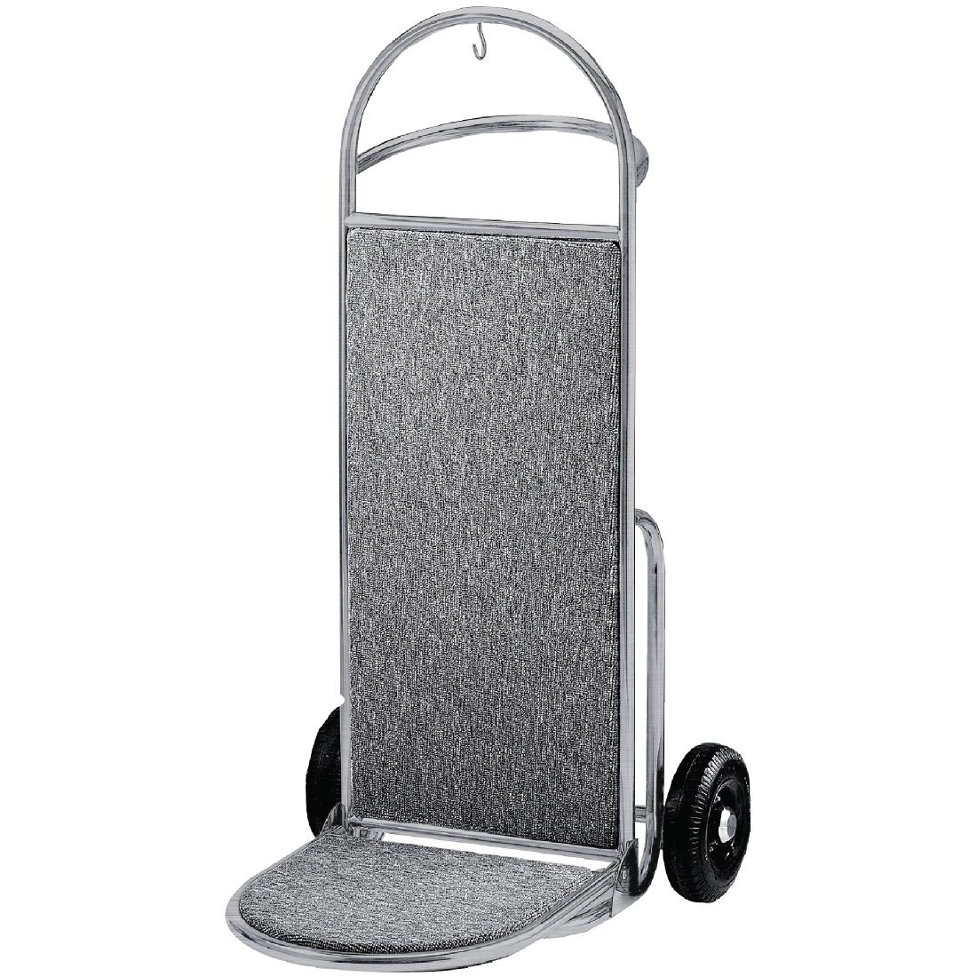 The contemporary and elegant trolley is suitable for use in public areas. It features a high load capacity, a hanging hook, dual handles, and two fixed wheels for easy transportation of heavy luggage. The grey carpeted loading base helps protect luggage.
