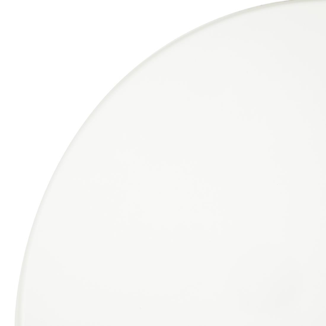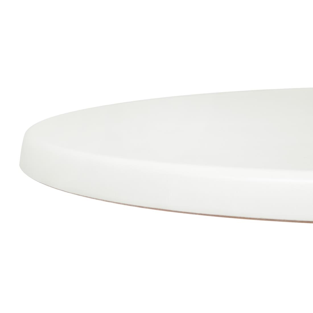 Pre-drilled seamless table top, finished in white for a neutral, clean look. Heat and water resistance guards against burns and spills, while the circular design eliminates sharp corners and danger of injury. Great for use indoors in cafes, canteens and restaurants.