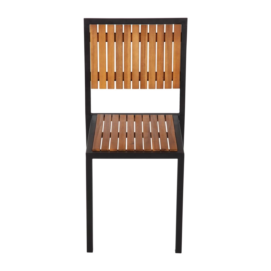 Supplied fully assembled, this charming steel and acacia wood side chair is a superb choice to reinvent your commercial dining venue. Simple in style, the wooden stackable side chair is both functional and immediately fashionable in any hospitality setting. The handsome contrast design of light acacia wood and strong matte black steel adds an urban, modern touch to your interior, versatile for pairing with traditional wooden furniture or bolder solid colors.