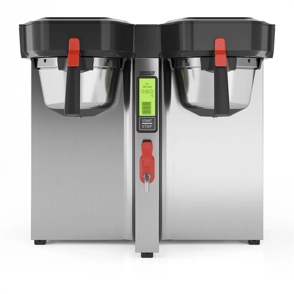 The Aurora Twin Low (Aurora TWL) brews filter coffee directly into two dispensers' bases. The touchscreen is easy to use, especially when utilizing the pre-set programs: mild, regular, and dark roast. However, the Aurora units allow professionals to optimize every setting of the brewing process, such as water temperature, coffee-water ratio, pre-wet, and brewing time. If you want to create homemade blends or serve single-origin coffees, this feature might be of particular interest. Additionally, you can use the water bypass.