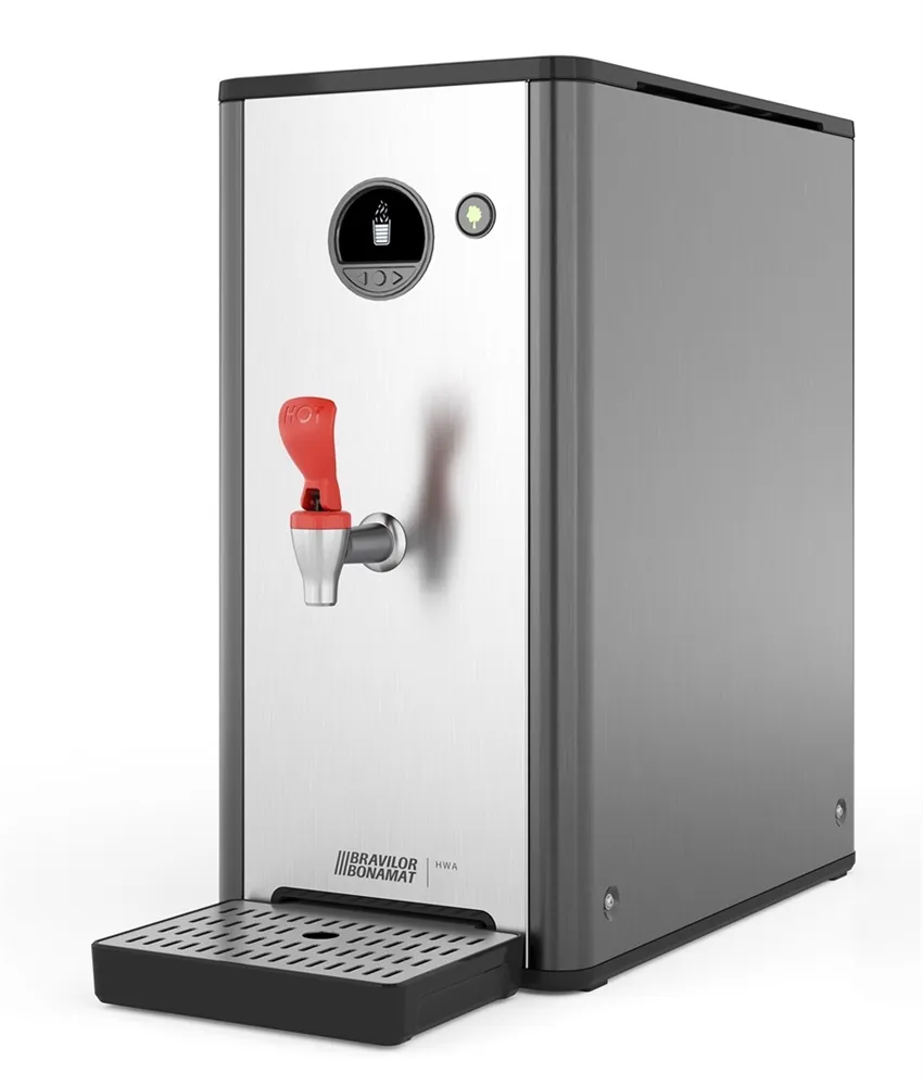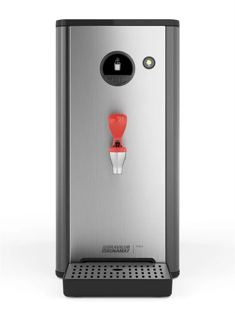 HWA 14 offers more than just basic functionalities such as prompt hot water dispensing and a high hour capacity. The machine is designed as a 360-degree solution, meaning that the unit looks attractive from all angles. Private branding is optional. Its compact, narrow footprint is space-efficient, making it ideal for various settings. The HWA 14 is user-friendly overall, featuring an LCD display that communicates clearly and allows for easy programming of the machine. Additionally, the HWA 14 is maintenance-friendly. The high-quality Bravilor Bonamat parts are sustainable, resulting in minimal maintenance and a long lifespan.