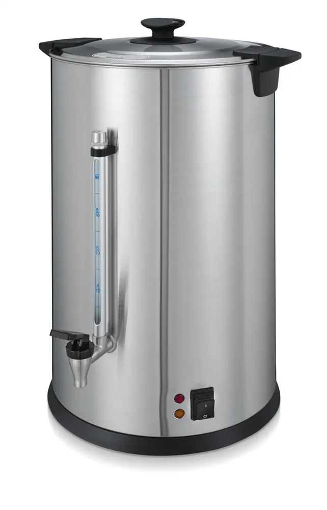 The coffee machine is crafted with double-walled stainless steel and does not require a connection to the mains water supply. It is equipped with a gauge glass, a boil-dry safety system, and a stainless steel filter, ensuring both safety and durability.