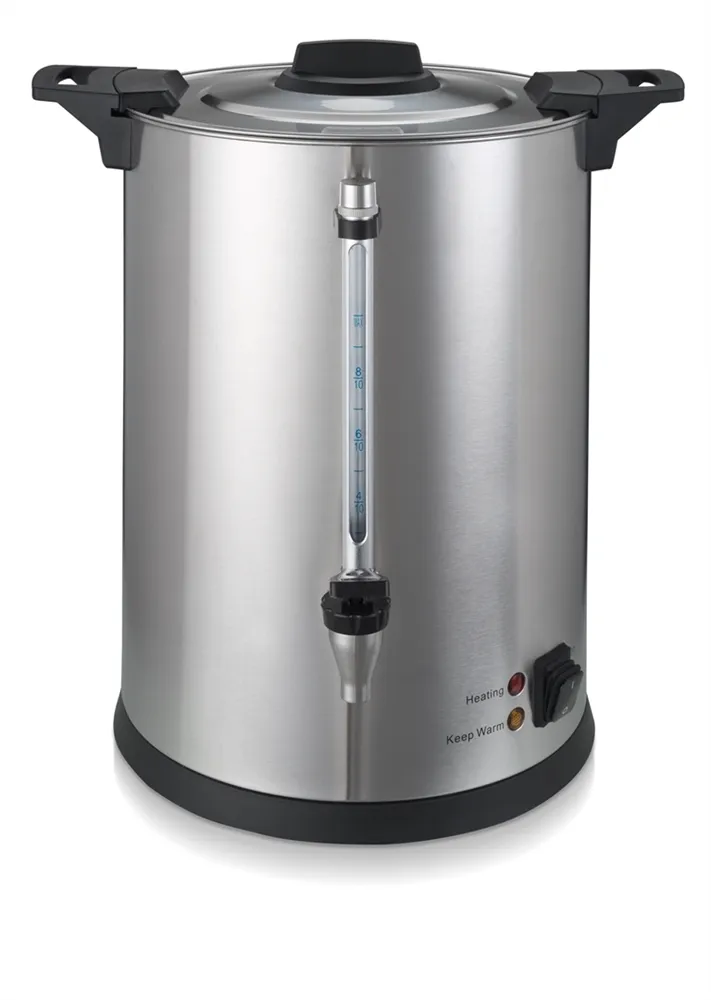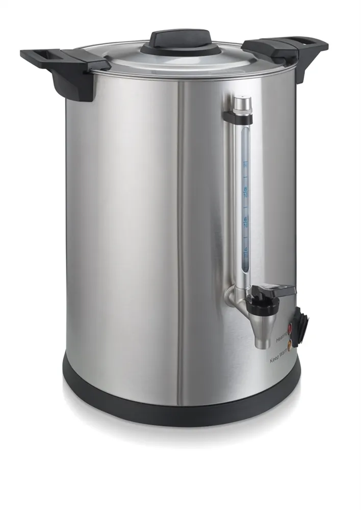 The coffee machine is crafted with double-walled stainless steel and does not require a connection for mains water supply. It is equipped with a gauge glass, a boil-dry safety system, and a stainless steel filter, ensuring durability and safety in use.