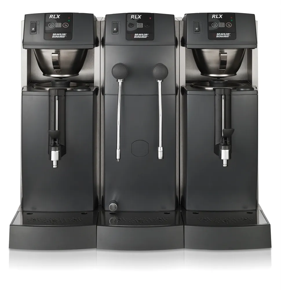 Buffet machines come with an integrated hot water or hot water/steam section, except for models RLX 5 and RLX 55. They include a connection for a mains water supply of 3/4 inch and allow for direct brewing into fixed containers. These machines are equipped with a coffee-ready signal and a descaling indicator. They also include stainless steel filter pans and a drip tray. The model features two brewing systems, two containers with gauge glass (2 liters each), and hot water and steam taps.