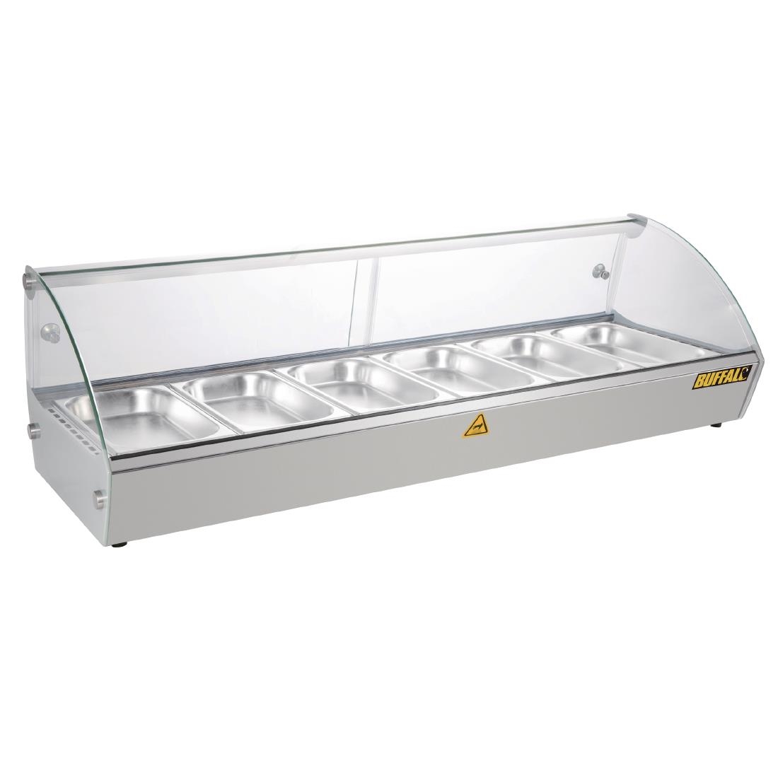 Attractive countertop food warmer/display unit with rear glass sliding doors for easy access.