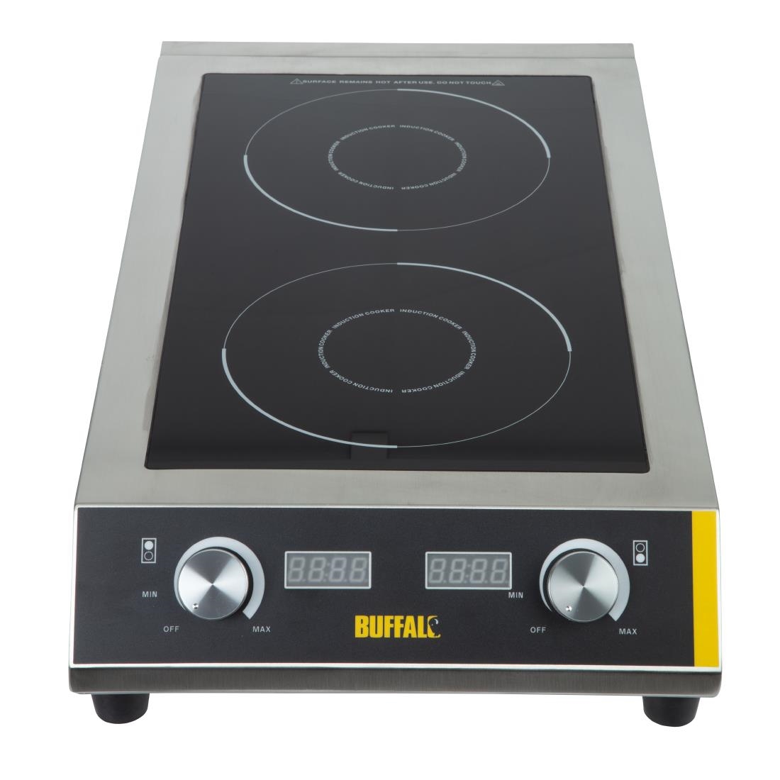 The Buffalo double ring induction hob is a powerful cooking appliance designed with a sleek, easy-to-clean stainless steel body. It features simple controls and a power display for user convenience. This induction hob is suitable for use with induction-compatible pans up to 280mm in diameter, making it a versatile addition to any kitchen.