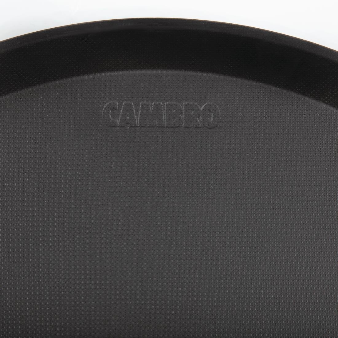 Offering the ultimate combination of versatility and durability, this 405mm black Cambro Treadlite fibreglass round non-slip tray is ideal for any restaurant, bar, or pub. The non-slip surface of this tray will prevent wet tableware from sliding, providing your waiting staff with complete peace of mind when navigating busy dining areas with an order full of drinks and food.