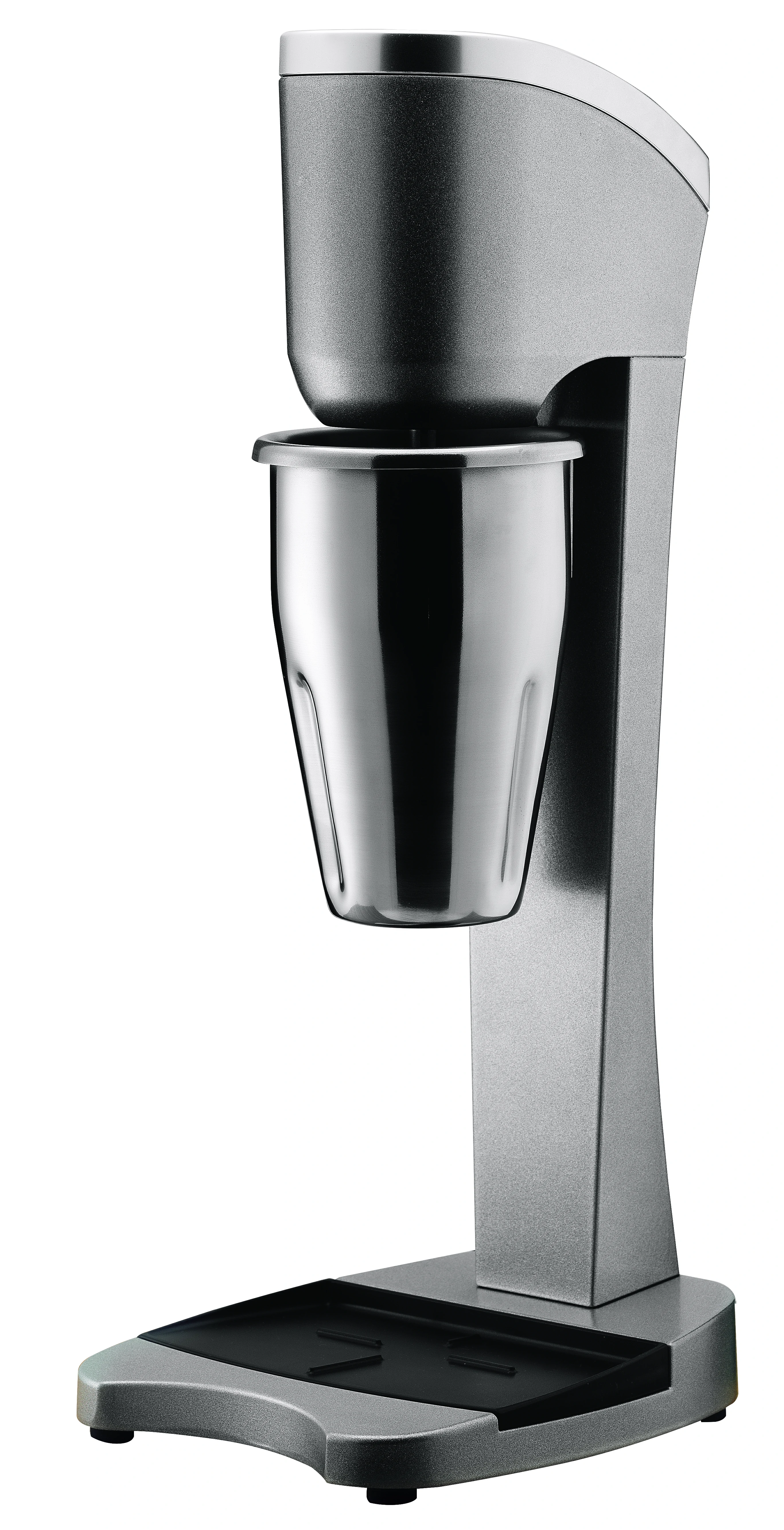 The commercial single spindle drinks mixer features a polished finish and comes with a stainless steel container. This mixer is designed for professional use, ensuring durability and efficiency in preparing a variety of beverages. Its sleek design and robust construction make it an ideal choice for commercial settings, providing reliable performance for busy environments.