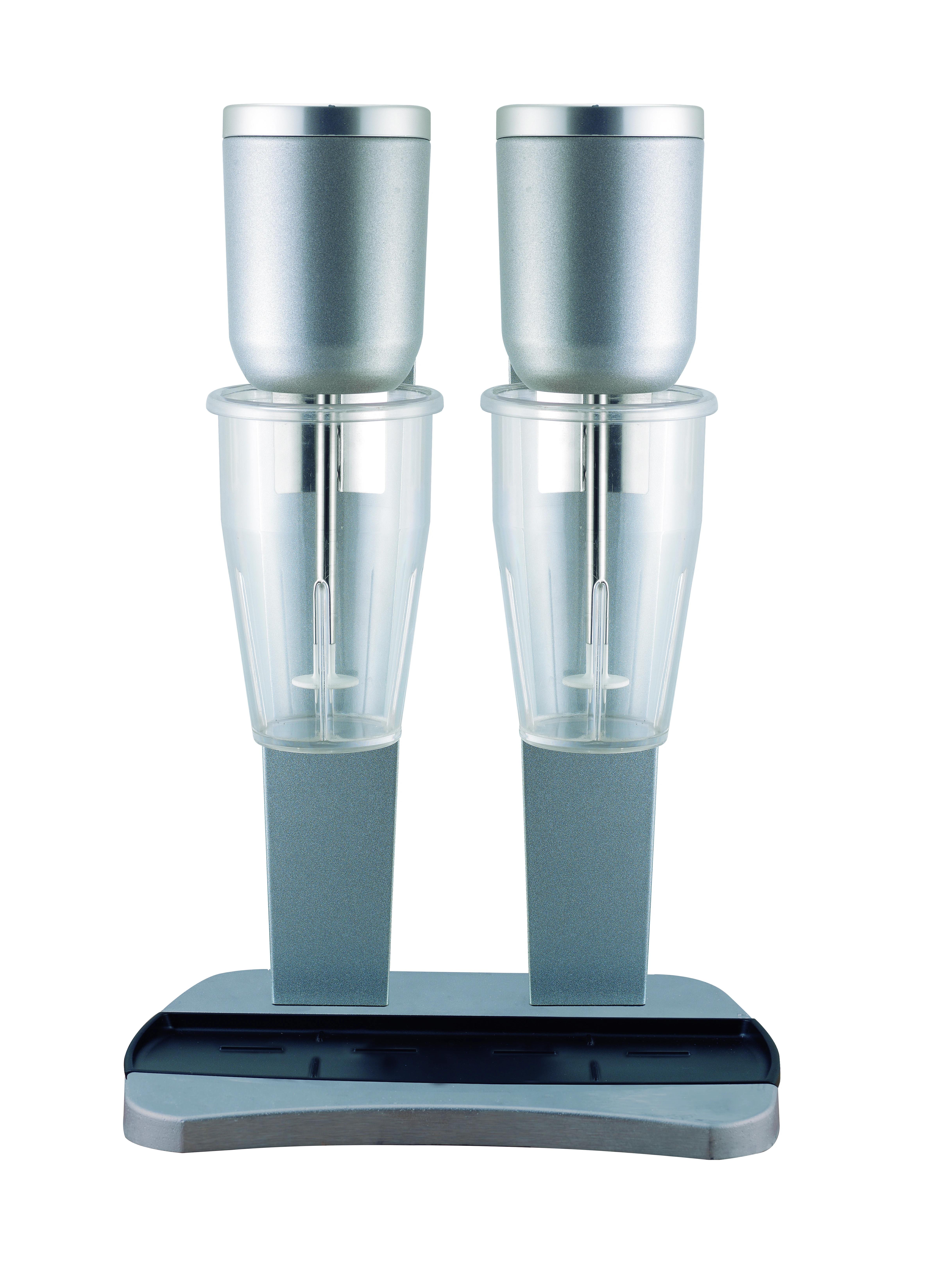 The commercial double spindle drinks mixer features a polished finish and is equipped with durable polycarbonate containers. This mixer is designed for high-performance blending, making it ideal for commercial settings such as cafes, restaurants, and bars. Its robust construction ensures longevity and reliability, while the dual spindle design allows for efficient mixing of multiple drinks simultaneously. The polycarbonate containers are not only sturdy but also provide a clear view of the mixing process, ensuring precision and consistency in every beverage prepared. This mixer combines functionality with a sleek, polished appearance, making it a valuable addition to any professional kitchen environment.