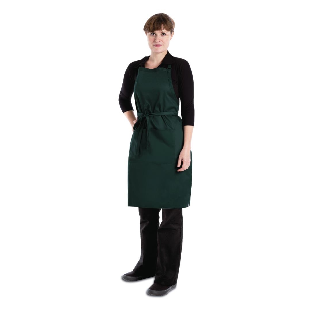 The Butcher Apron in green is designed with an adjustable neck buckle to provide the perfect fit for maximum comfort while you work. It features a front patch pocket with a center divide, offering ample space to store and easily access essential catering accessories. Crafted from a polycotton fabric blend, this apron is built to withstand daily use in bustling culinary environments.