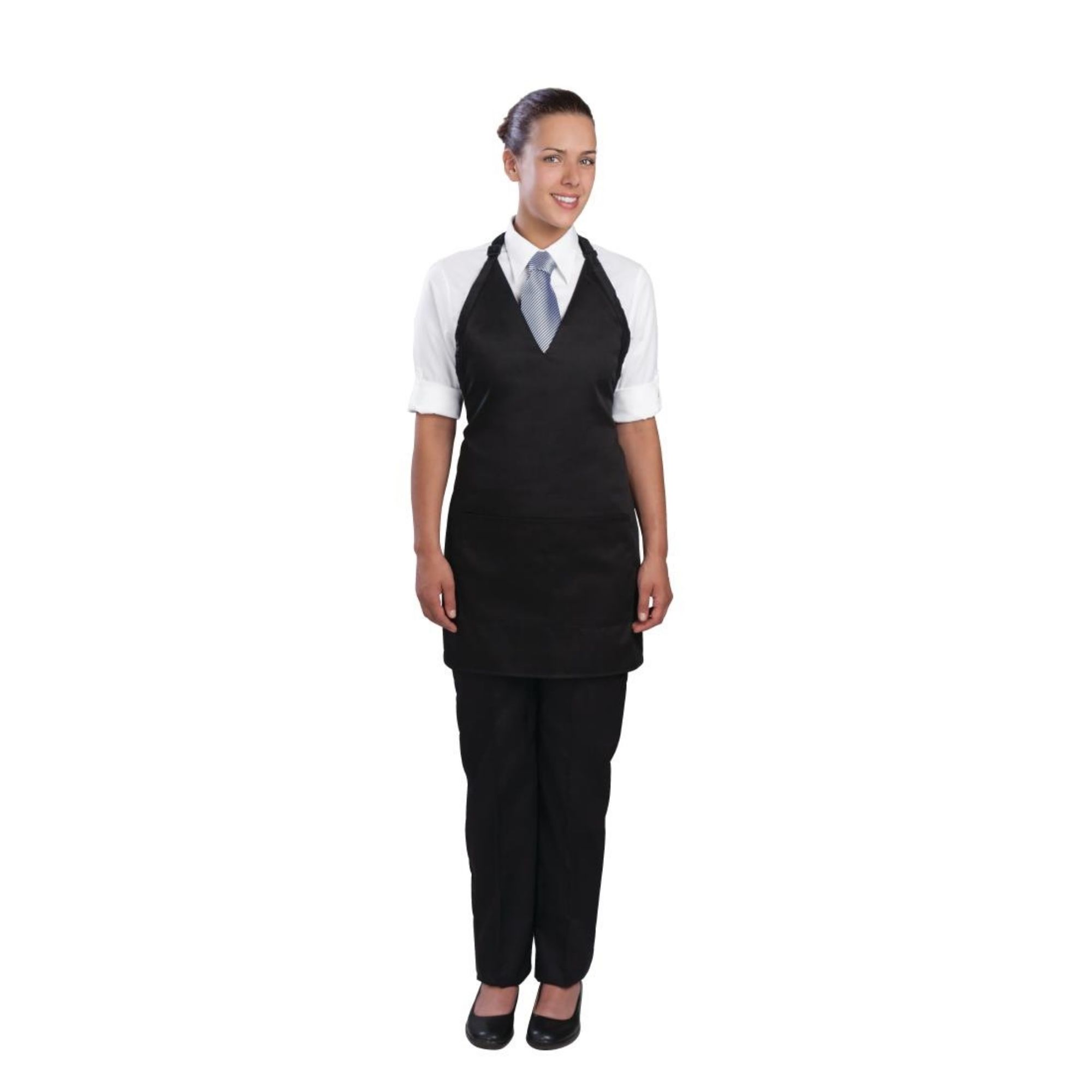 The distinctive, attractive, and practical black V-neck polycotton apron features a center divided pocket, making it an ideal choice for bistro, café, and restaurant use.