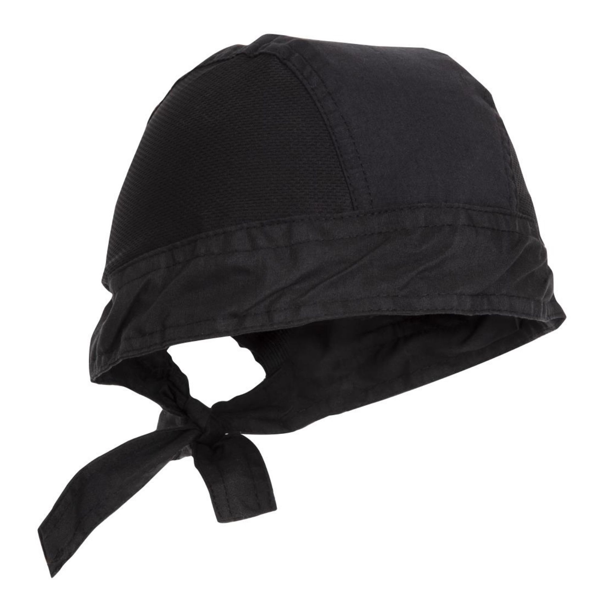 Update your uniform and keep staff cool with this black chef's bandana. Thanks to its moisture-wicking panels, the bandana effectively keeps heads free from sweat and condensation. This feature not only maintains excellent comfort but also prevents liquids from falling into food and drink.