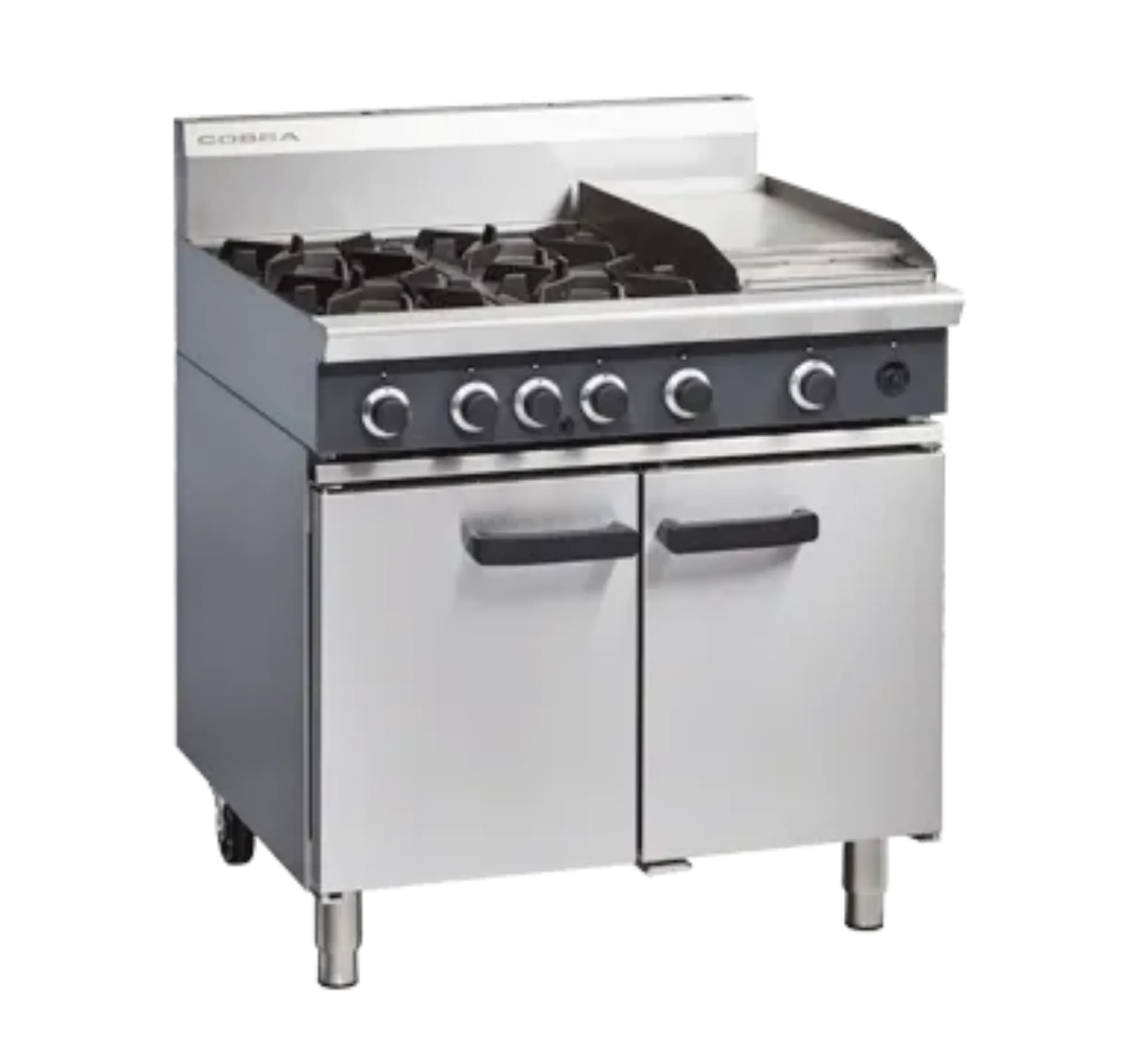 The gas Blue Seal Cobra Series CR9C is an immensely versatile oven range, featuring four powerful 5.5kW open burners, a 2/1 GN compatible oven, and a heavy-duty 300mm griddle. It is suitable for the most demanding kitchen environments. Perfect for cooking breakfast, lunch, or dinner services, the Blue Seal Cobra CR9C has been designed to be uncompromising in its performance, reliability, and safety. With robust, precise control dials and heavy-duty stainless steel construction throughout, the Blue Seal is easy to use, clean, and maintain.