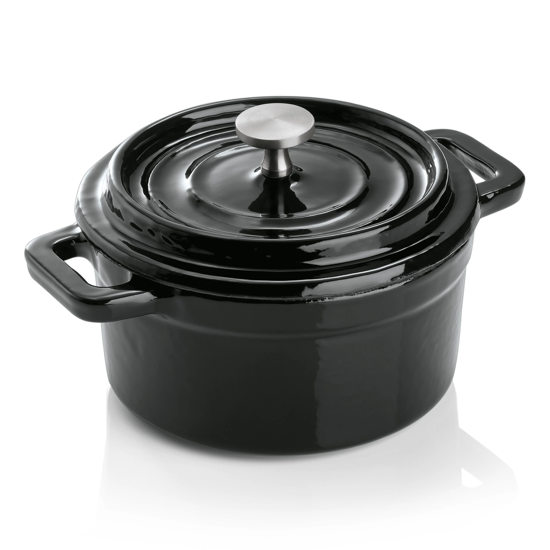 The product features an enamelled lid equipped with a stainless steel handle. This design ensures durability and ease of use, making it a practical addition to any kitchen. The enamel coating provides a smooth, easy-to-clean surface, while the stainless steel handle offers a sturdy grip, enhancing safety and comfort during use.