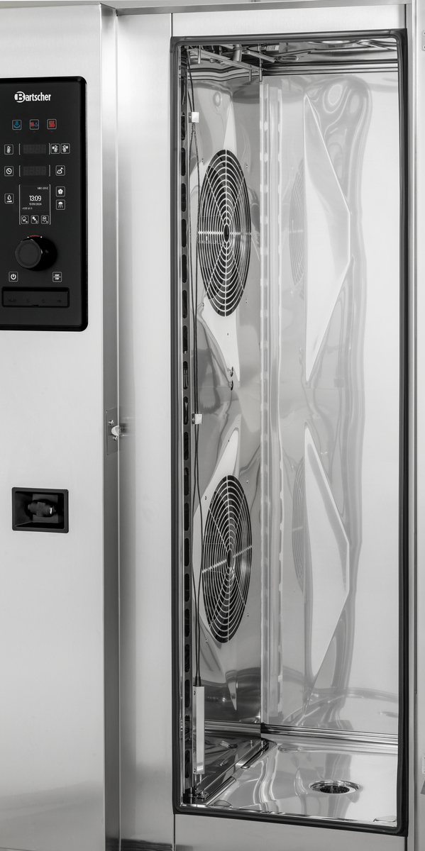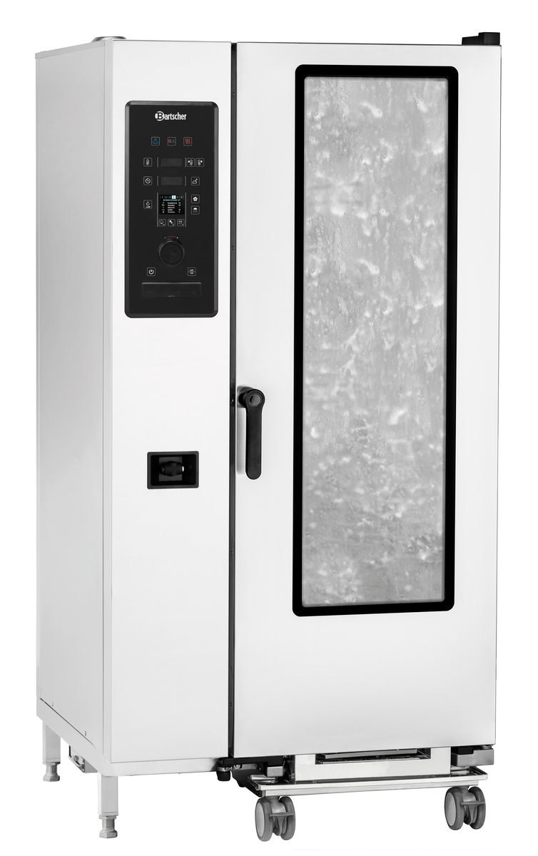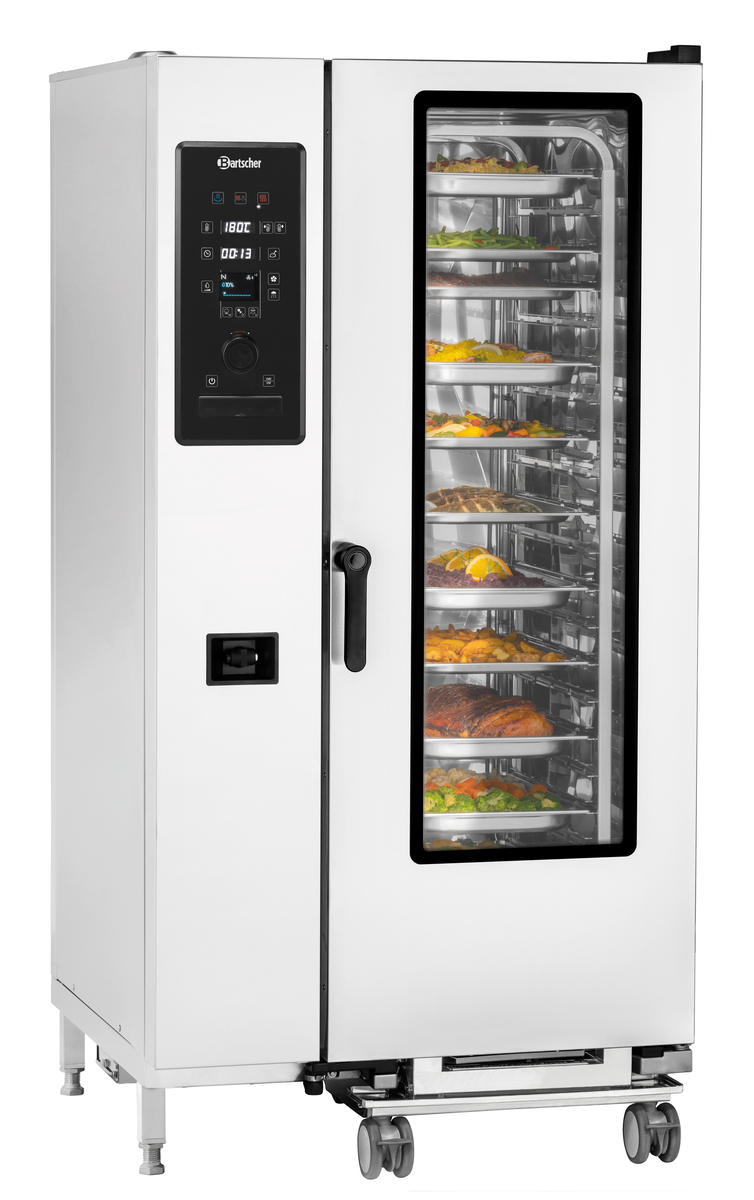 The combi-steamer with a tray trolley for 20 GN containers 1/1 GN is designed for maximum cooking in minimal space, making it ideal for producing large quantities. It is the perfect partner for preparing food in communal kitchens and large canteens. This appliance offers full functionality, including a 4-point core temperature sensor, Delta-T cooking, low temperature cooling, and a cleaning system.