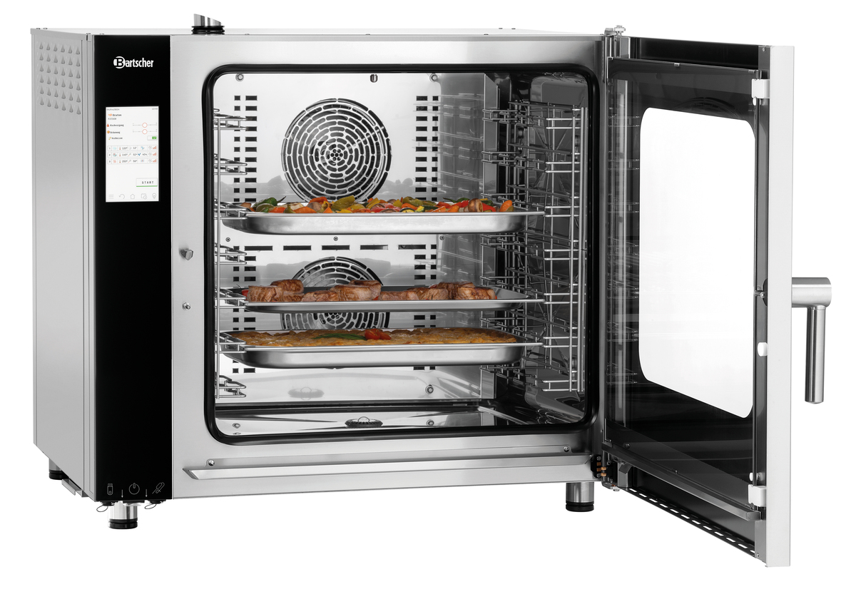 The Bartscher Silversteam2 combi steamer features seven 1/1 GN inserts and boasts an impressive integrated cleaning system. Whether equipped with a core temperature sensor or not, the electronic controls facilitate demand-based regulation of all cooking processes. Additionally, the rack control function allows for the preparation of different foods at varying times, enhancing cooking efficiency and flexibility.