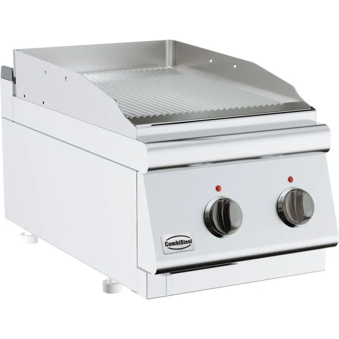 The CombiSteel Base 700 Electric Fry Top features a 400 grooved ribbed surface, designed for efficient cooking. This table-top appliance is ideal for professional kitchens, providing a reliable and durable cooking surface. The grooved ribbed design ensures even heat distribution, making it perfect for grilling and searing a variety of foods. Its compact size allows for easy placement on any kitchen counter, while its robust construction ensures long-lasting performance. This electric fry top is a valuable addition to any culinary environment, offering versatility and precision in cooking.