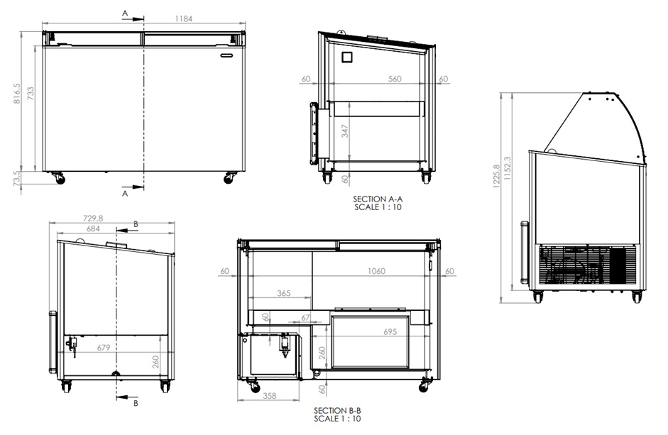 - Storage space for 10 ice bins of 5L (36x16.5)