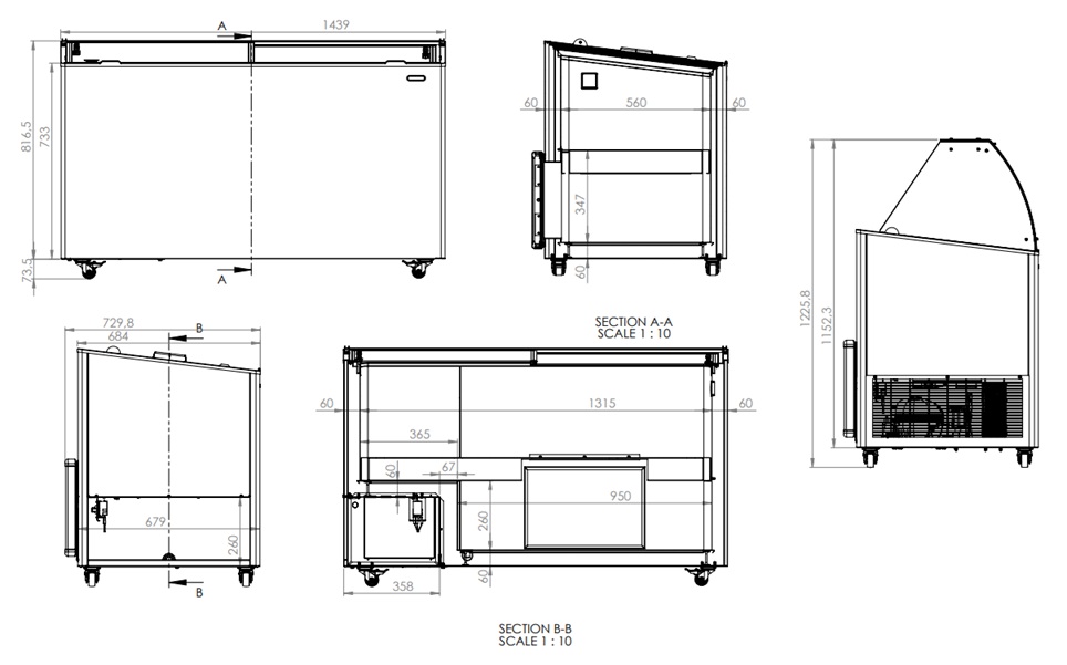 - Storage space for 12 ice bins of 5L (36x16.5)
