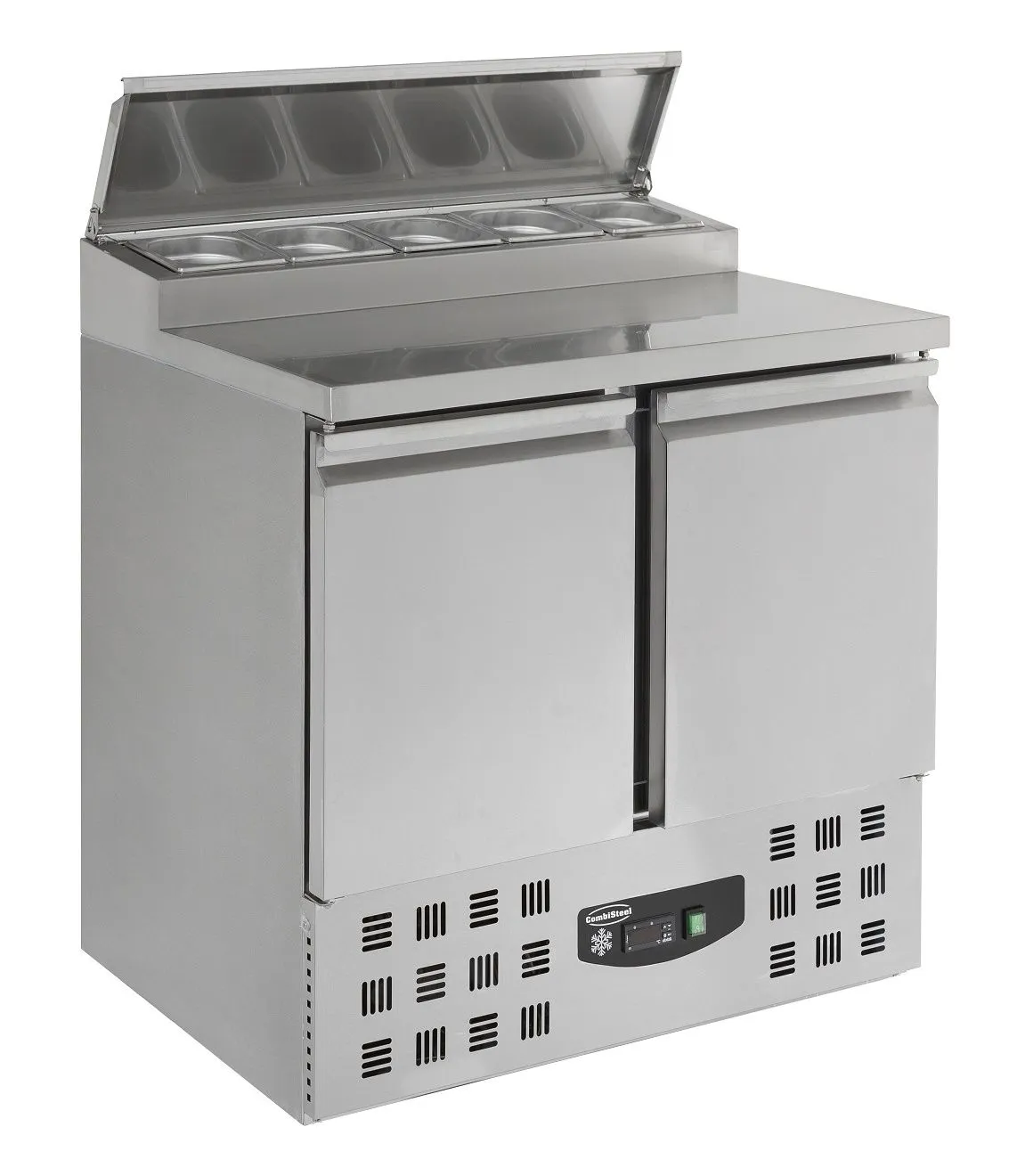 The stainless steel two-door saladette fridge from Comsbiteel is designed for efficient food preparation and storage. It features a top section that accommodates five GN1/6 pans, providing ample space for organizing ingredients. This fridge is ideal for commercial kitchens seeking durable and practical refrigeration solutions.