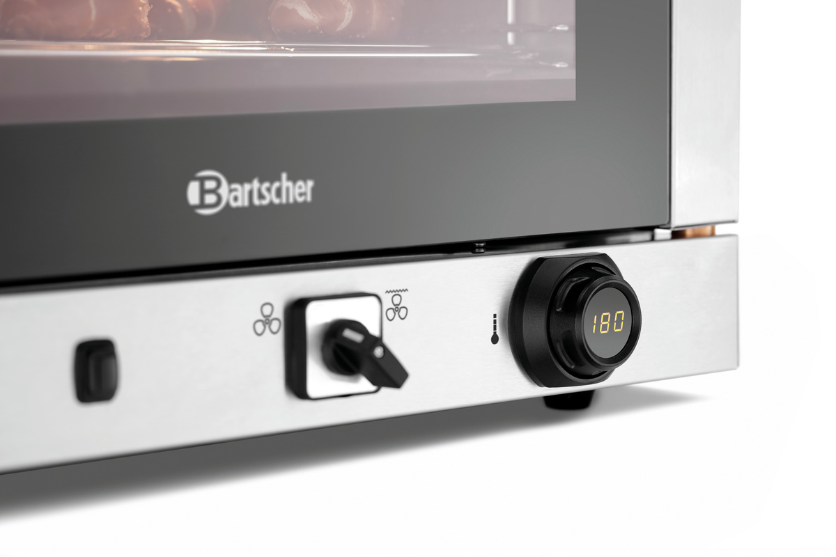 The AT230-MDI simplifies the loading of the baking chamber thanks to the side door hinge. It meets all requirements since it combines tried-and-tested AT features with an additional grilling function and steaming. The digital Bartscher MDI control ensures top ease-of-use with quick and easy temperature and time regulation.