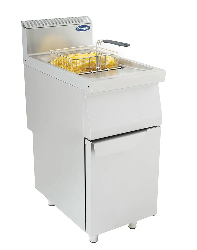 The CookRite Single Tank Fryer 4F-F features a long-lasting stainless steel tank and quality crafted construction with three cast iron burners. Its value is enhanced by its excellent performance and efficiency. The unit includes auto-ignition and flame failure protection, ensuring safety and reliability. With a 16-liter oil tank capacity, it is well-suited for any medium-range commercial kitchen.