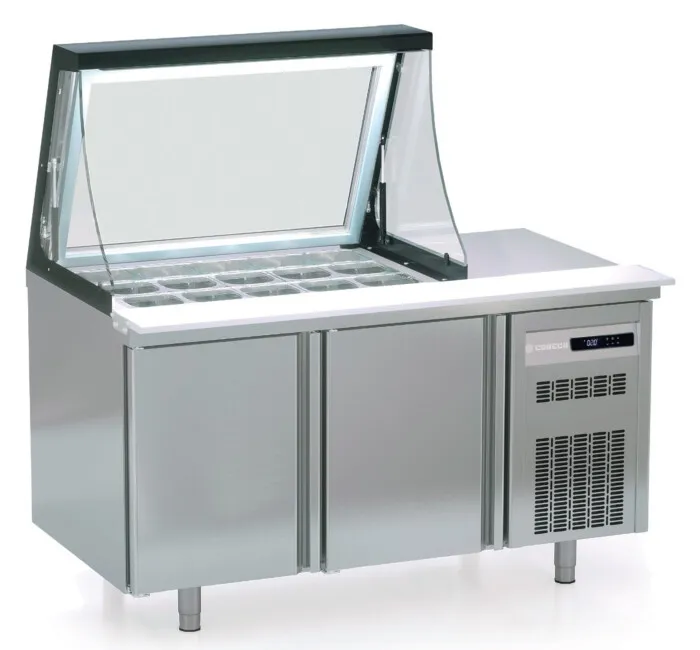 The Coreco PC80-150-15-LGL is a unique two-door prep station featuring a lift-up glass lid and an integrated glass screen with LED lighting. This design ensures that your produce is kept at an ideal storage temperature while also being on display to customers. With a capacity of 15 x 1/6 GN pans and three doors, the PC80 offers ample space for various types of businesses and situations. Additionally, the three-door model, PC80-200-27-LGL, is also available.