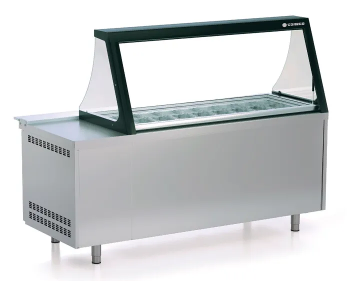 The Coreco PC80-200-27-LGL is a unique three-door prep station featuring a lift-up glass lid and an integrated glass screen with LED lighting. This design ensures that your produce is kept at an ideal storage temperature while also being on display to customers. With a capacity of 27 x 1/6 GN pans and three doors, the PC80 offers ample space for all types of businesses and situations. Additionally, a two-door version, the PC80-150-27-LGL, is also available.