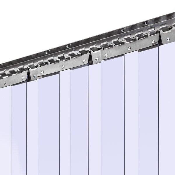 Combisteel curtains for cold and freezer rooms are clear PVC strip curtains designed to reduce cold loss through door openings while allowing easy walk through and trolley access. The set is sized 1100 mm wide by 1900 mm high and includes a 110 cm suspension rail that can be mounted to a wall or ceiling. You can set the strip overlap from 40 percent to 80 percent for better sealing, then trim the bottom to leave a small gap above the floor