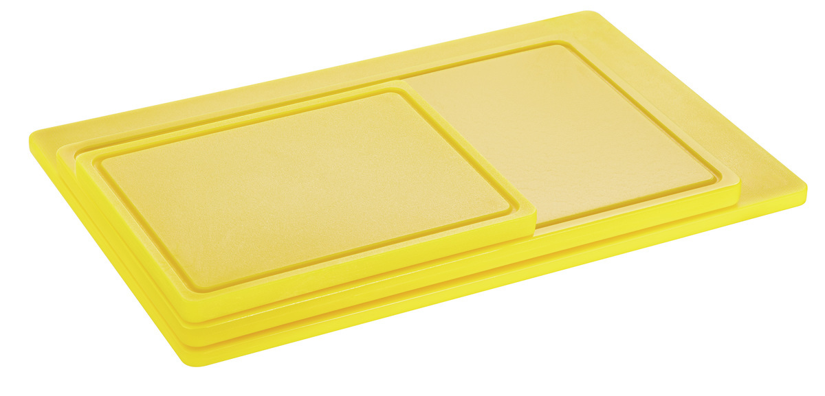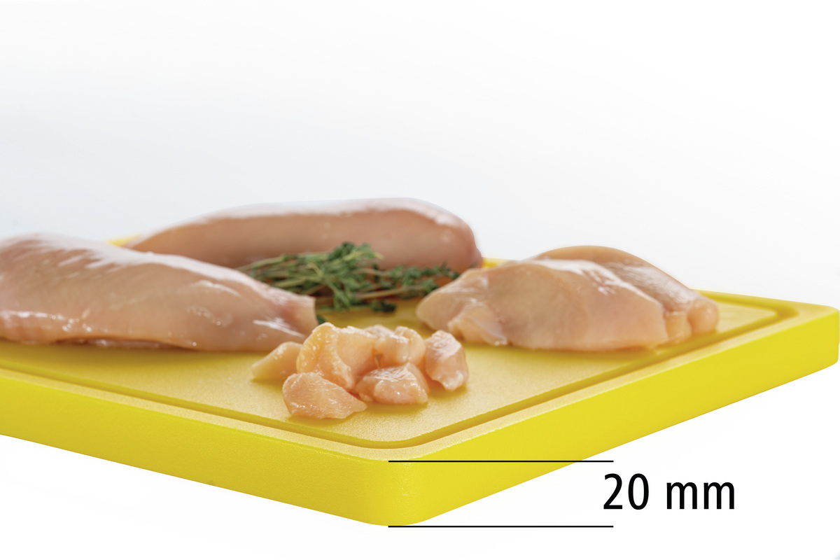 The chopping board series PRO, measuring 32 x 26 cm, emphasizes hygiene by offering differently colored boards for various food groups. This HACCP-compliant yellow chopping board is specifically designed for chopping poultry.