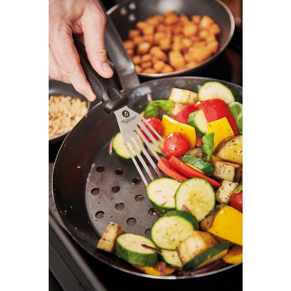 The ergonomic handle, crafted from polyamide reinforced with fiberglass, offers a comfortable grip. Equipped with an anti-slip carbon fibre texture, this turner provides secure handling and is complete with a slot for the thumb and a finger stopper for added control.