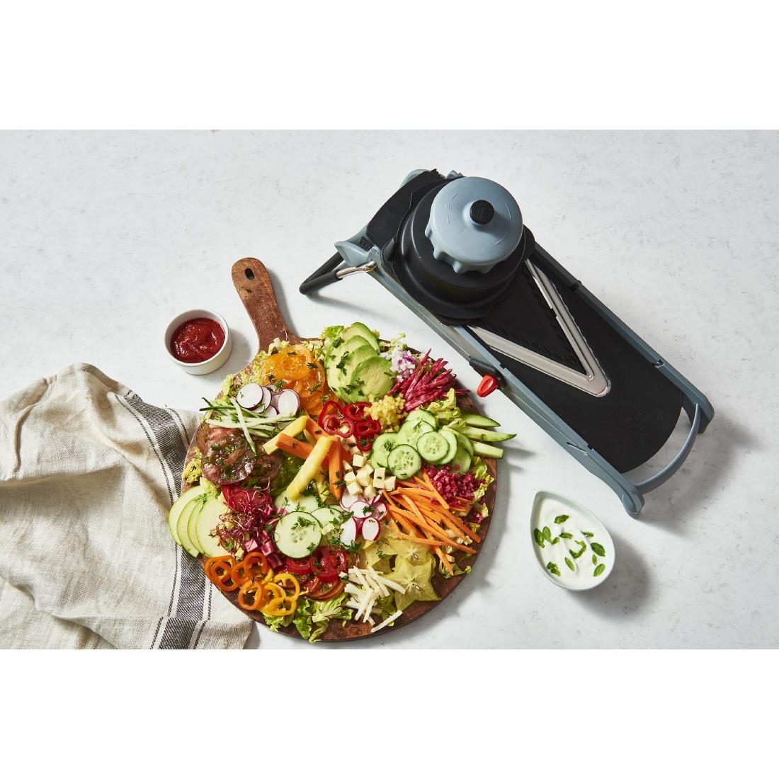 With its sturdy frame and integrated V-Shape adjustable blade, the De Buyer Viper provides flexibility, allowing you to cube, slice, julienne and diamond-cut foods smoothly and to your required thickness. For safety, the mandolin includes a pusher/slider which also promotes user comfort during use. And once you're all done, the whole unit is easy to fold away for simple storage.