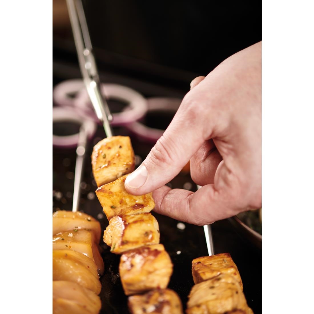 Make grilling easy with the 350mm skewers from De Buyer. The end is pointed and tapered to allow for easy penetration without squashing. The flat design also means food won't slip off during use. Hooked end makes the skewers easy to grip. And as they're made from stainless steel, the De Buyer skewers are highly durable - providing long-lasting use in professional environments.