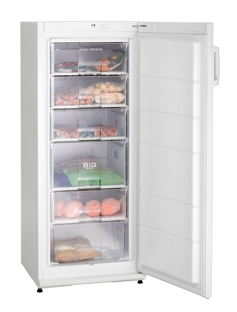 The 6-drawer freezer offers an organized solution for storing frozen products. Featuring a Big Box, it allows for the easy freezing and storage of even large items. Its simple white design ensures that it seamlessly integrates into any kitchen or storage room.