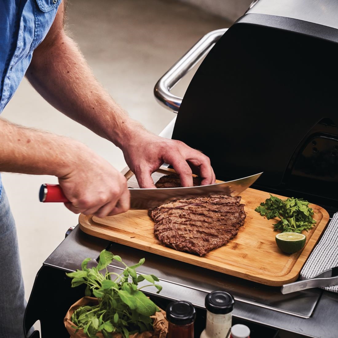 Anyone who loves meat will also love the Dick Red Spirit Hektor carving knife. The knife is ideal for cutting larger pieces of meat and fish, and it is also perfect as a brisket knife for BBQ areas. Its long, curved blade allows for a drawn cut, enabling you to cut large pieces without stopping. The round knife handle, with an Asian touch, provides an exceptional feel. It is ergonomic and gentle in your hand, offering a perfect contrast to the precise and sharp cutting edge.