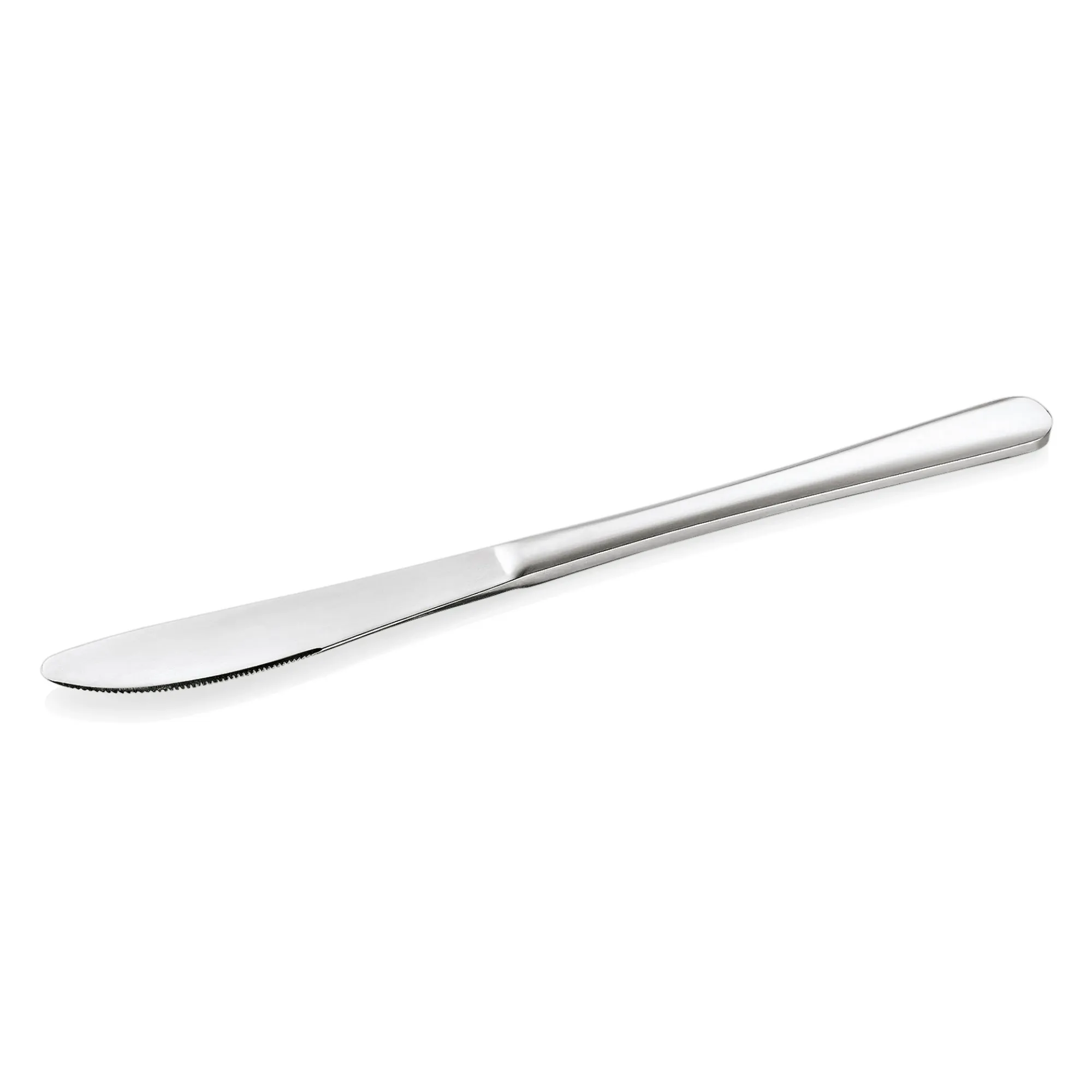The dinner knife is an essential piece of cutlery designed for use during meals. It features a smooth, slightly curved blade that is ideal for cutting through cooked meats, vegetables, and other food items typically served during dinner. The handle is ergonomically designed to provide a comfortable grip, ensuring ease of use. Made from high-quality stainless steel, the dinner knife is both durable and resistant to corrosion, maintaining its sleek appearance even after repeated use. Its elegant design complements any table setting, making it suitable for both casual and formal dining occasions. Whether you're hosting a dinner party or enjoying a quiet meal at home, the dinner knife is a versatile and indispensable tool for your dining experience.