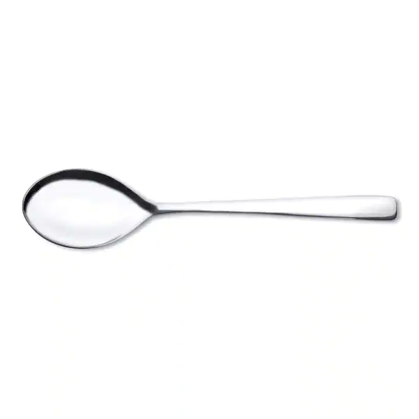 The dinner spoon features a durable plastic handle, providing a comfortable grip for everyday use. Its sleek design makes it a versatile addition to any dining set, suitable for both casual meals and formal occasions. The spoon's polished finish ensures easy cleaning and maintenance, while its sturdy construction guarantees long-lasting performance. Ideal for enhancing your dining experience, this dinner spoon combines practicality with style.