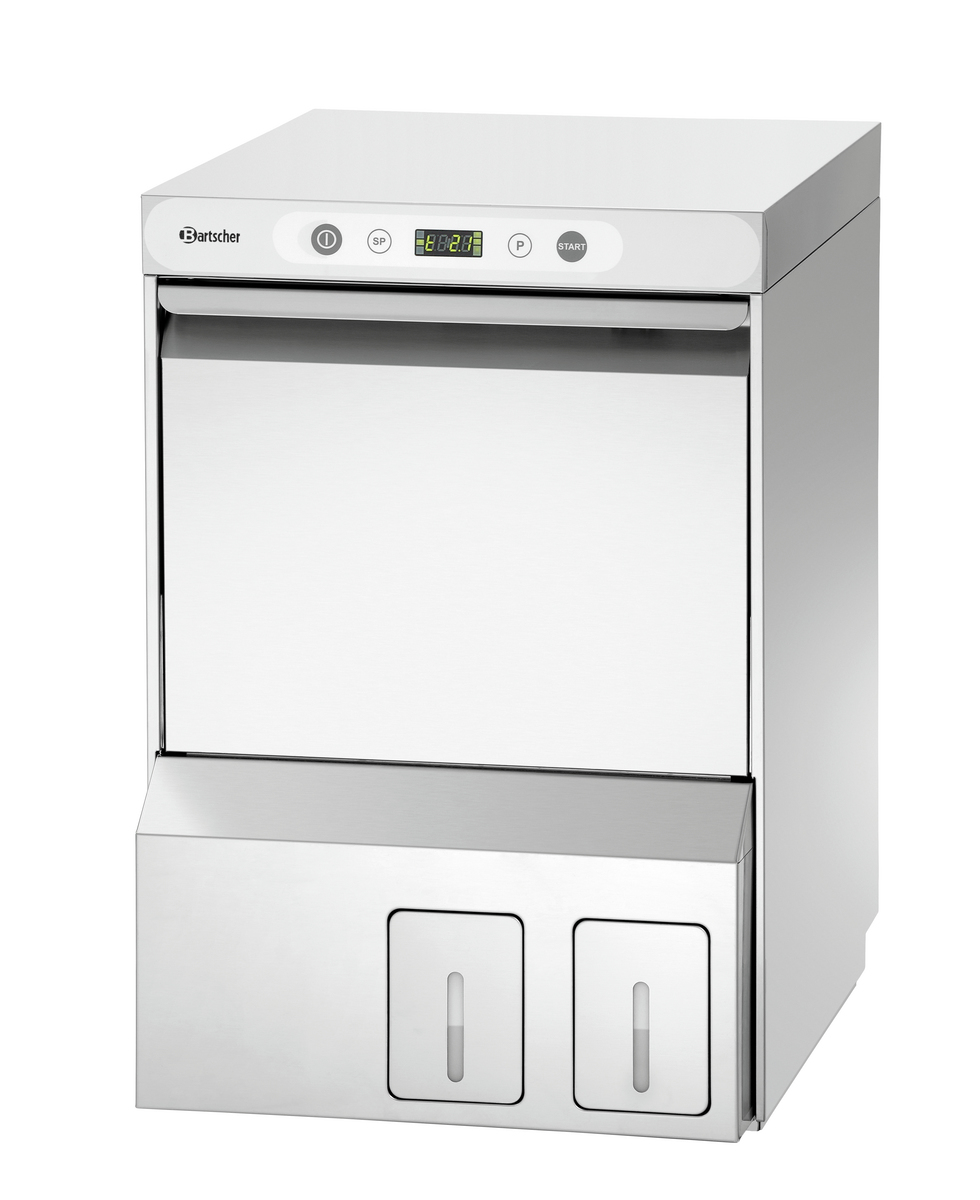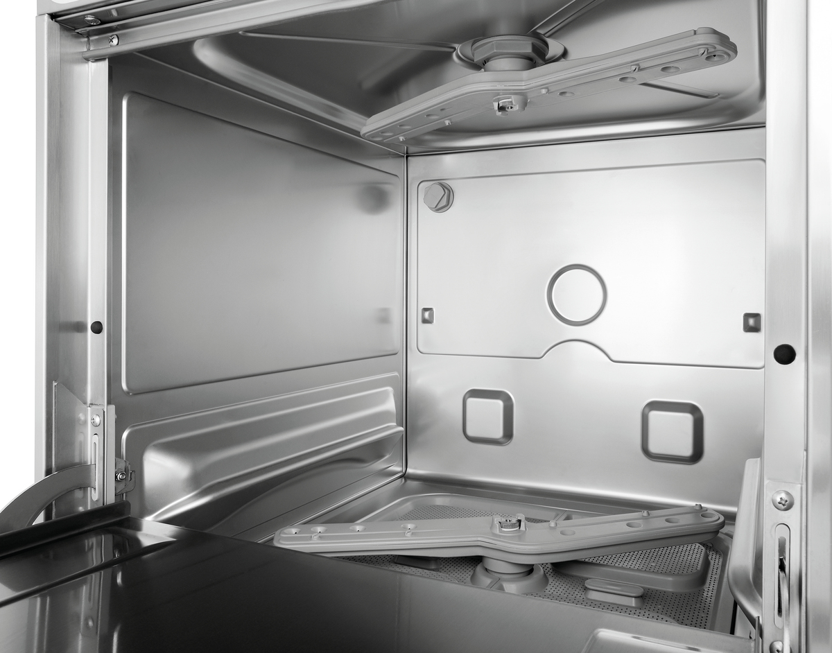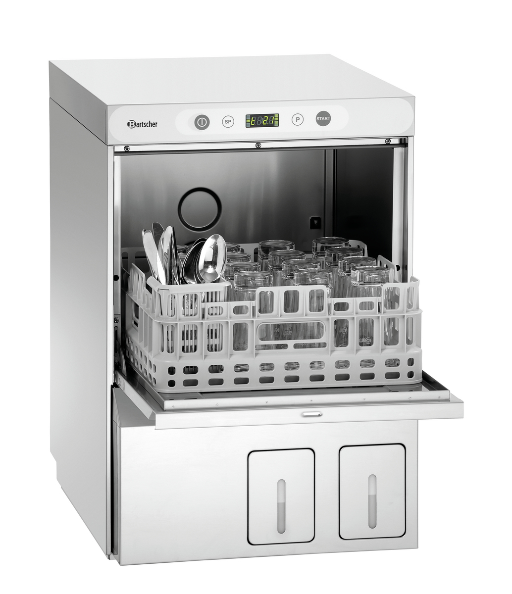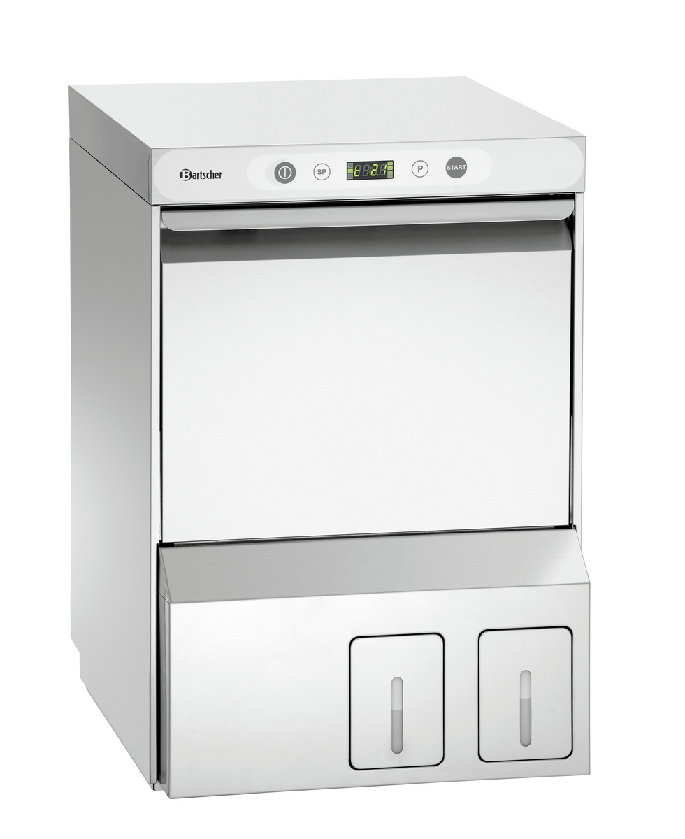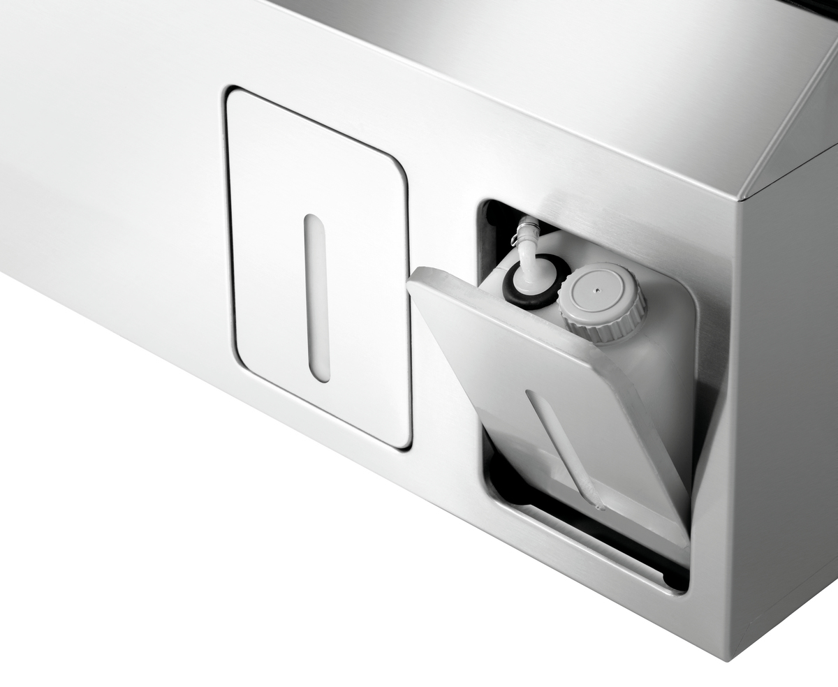 This glass dishwasher is a space-saving solution for small kitchens and sculleries. Thanks to the pre-installed cleaning kit with integrated canisters for detergent and rinse aid, no additional space is needed for dishwasher accessories such as canisters and hoses in the kitchen.