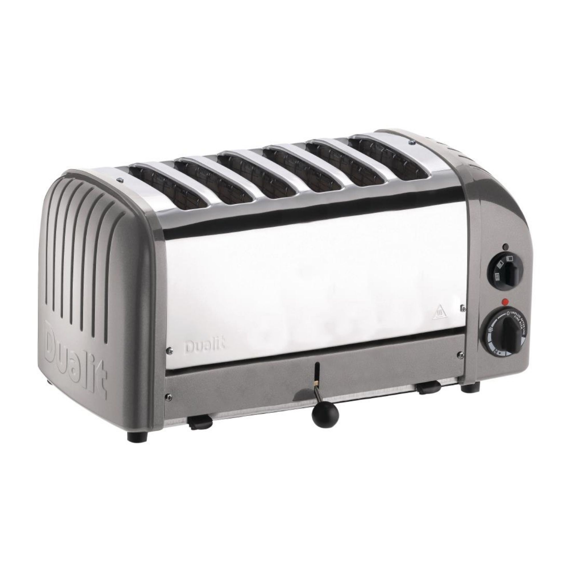 The 6-slice toaster from Dualit is finished in a stylish metallic silver and is designed for use in commercial catering establishments. The toaster features extra-wide slots measuring 28mm, which can accommodate sliced bread, buns, crumpets, and even sandwiches when using a Dualit sandwich cage (available separately). It includes a mechanical timer for easy control over browning and a manually operated ejector lever that keeps items warm inside the toaster until needed. Additionally, a selector switch allows only the required slots to be used, saving on energy. The toaster also includes a high lift mechanism, enabling the safe removal of small items.