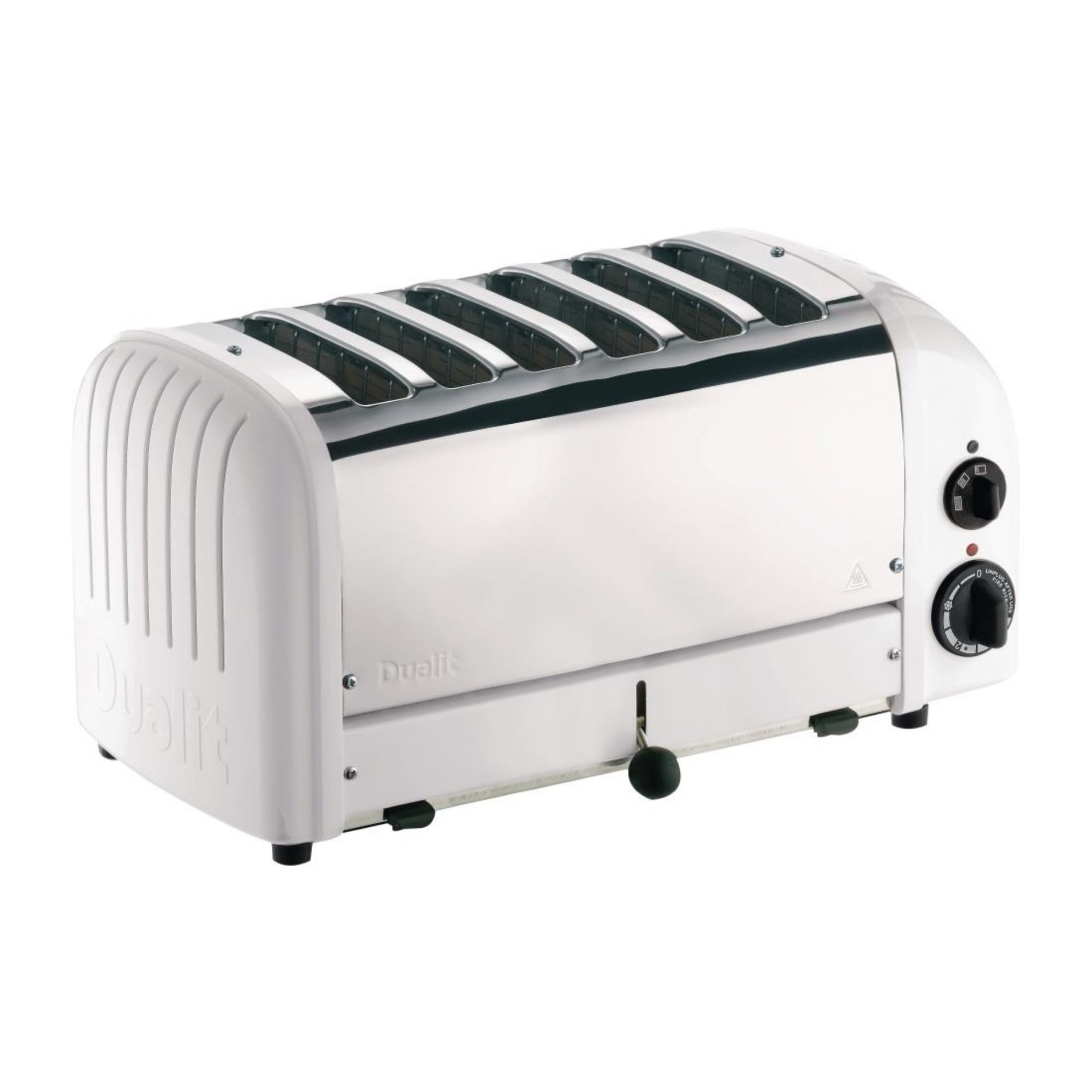 The Dualit toaster is a versatile, plug-in appliance featuring six slots, making it ideal for both domestic and commercial kitchens with a high output of toasted bread. This stylish and iconic toaster is finished in white and is a long-lasting addition to any kitchen due to its hard-wearing, sturdy structure and easily replaceable ProHeat elements. A simple selector switch allows you to use only the slots required, and the straightforward timer ensures bread is toasted to your desired outcome.