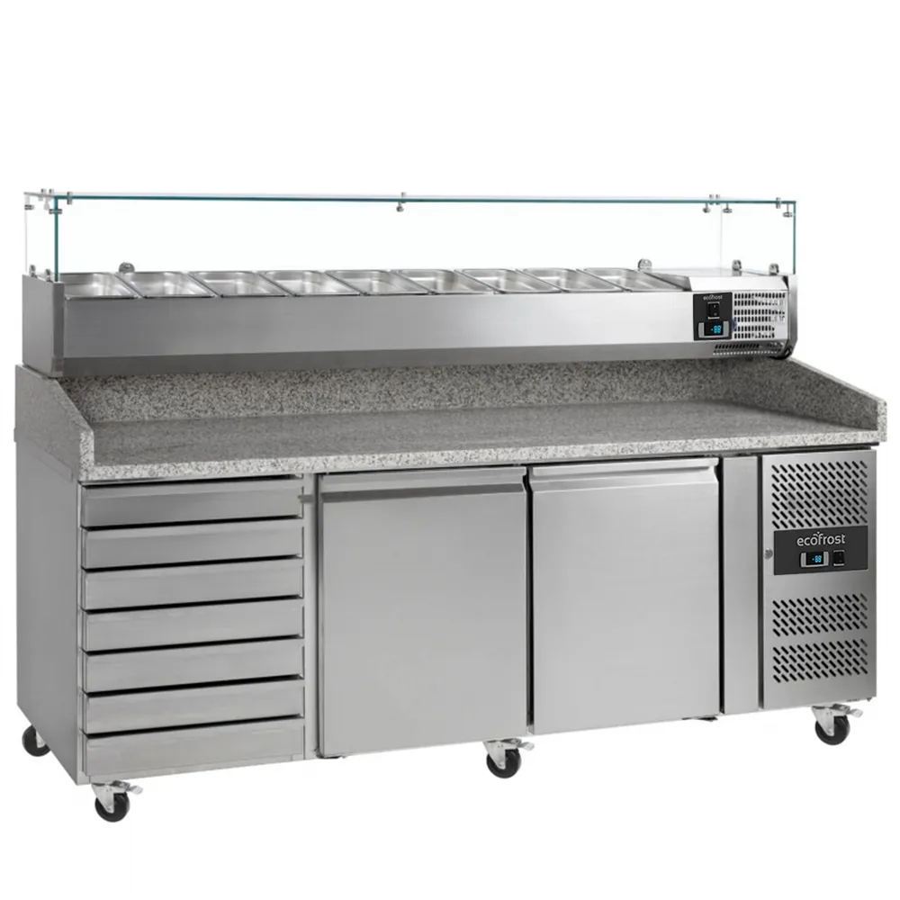 The Premium Pizza Prep Counter Fridge from Ecofrost is a 2-meter counter prep fridge that offers ample storage space beneath and includes seven dough drawers. The granite worktop provides an excellent preparation surface for pizza bases, as it resists dough sticking, allowing for a more practical and efficient preparation process.