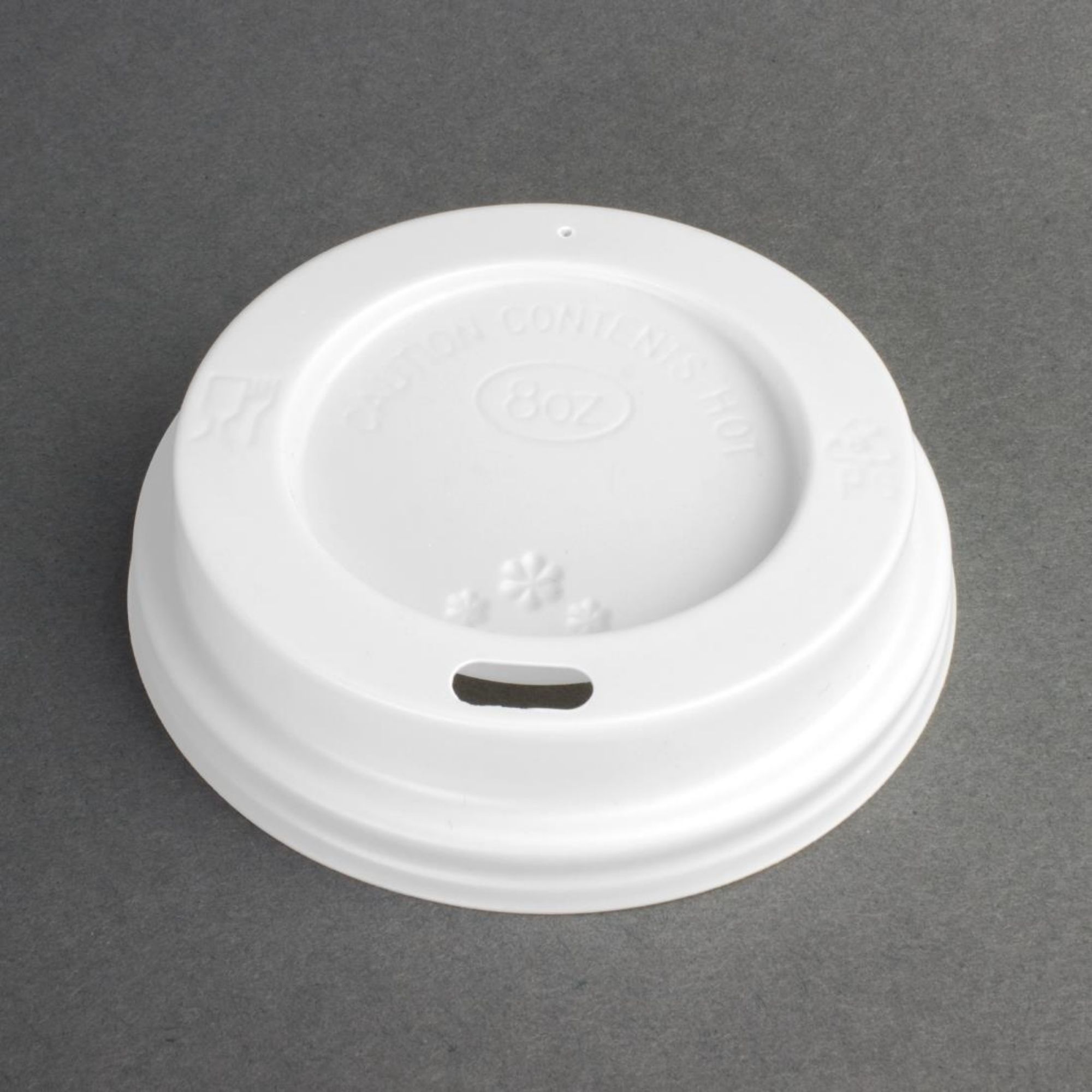 Add practical and cost-effective lids to your hot-drink options with the 8oz white disposable coffee cup lids from Fiesta. Thanks to the tight fit, these hot cup lids minimize the risk of spills and leaks, protecting your guests from stains and burns when drinking tea, coffee, or hot chocolate.