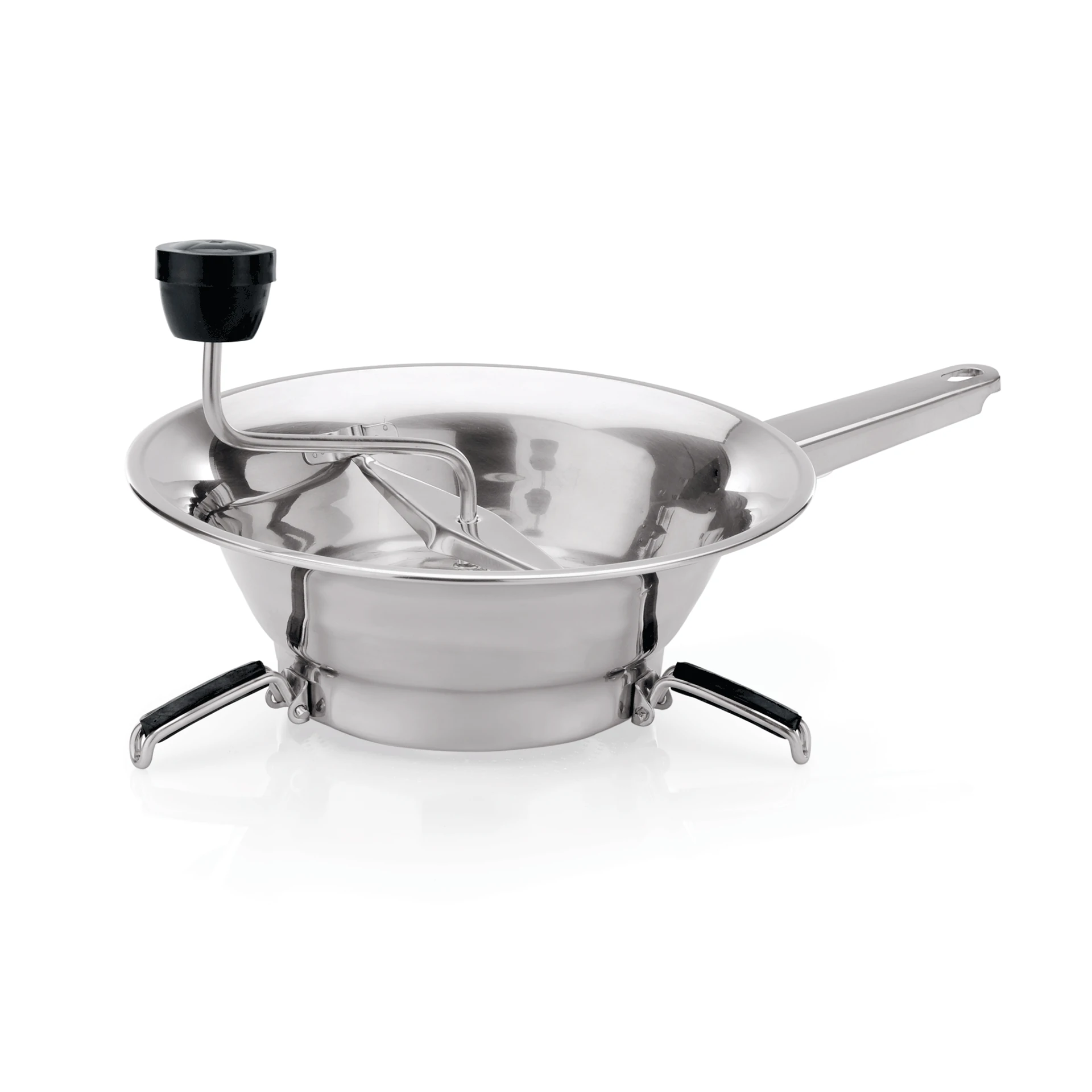This product features a hand crank, three interchangeable sieve inserts, and fold-out feet.