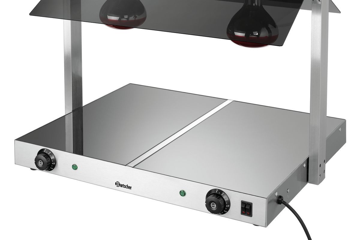 The dual thermal effect features infrared lamps that can be controlled separately, along with glass-ceramic hotplates, to keep food warm at an individually set temperature.