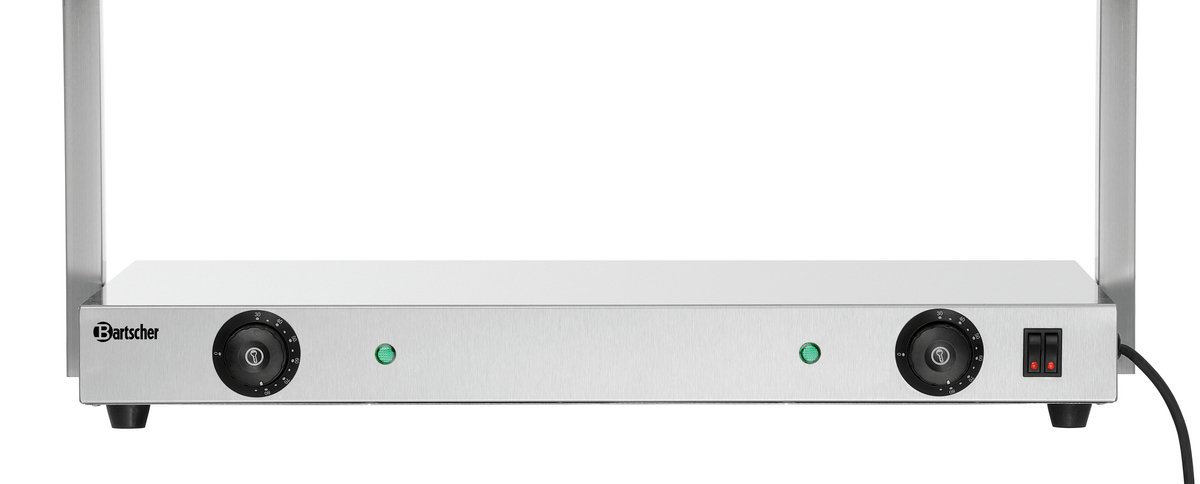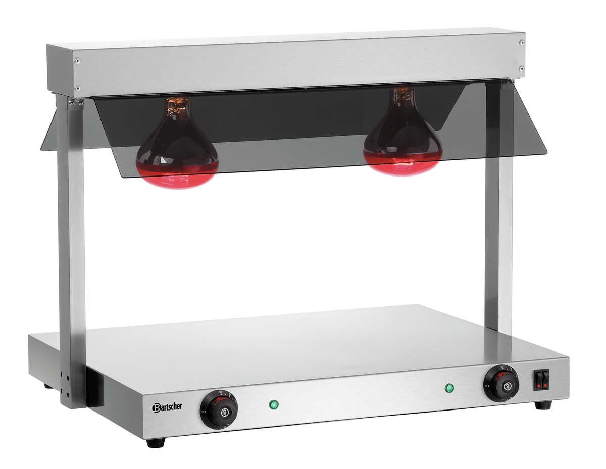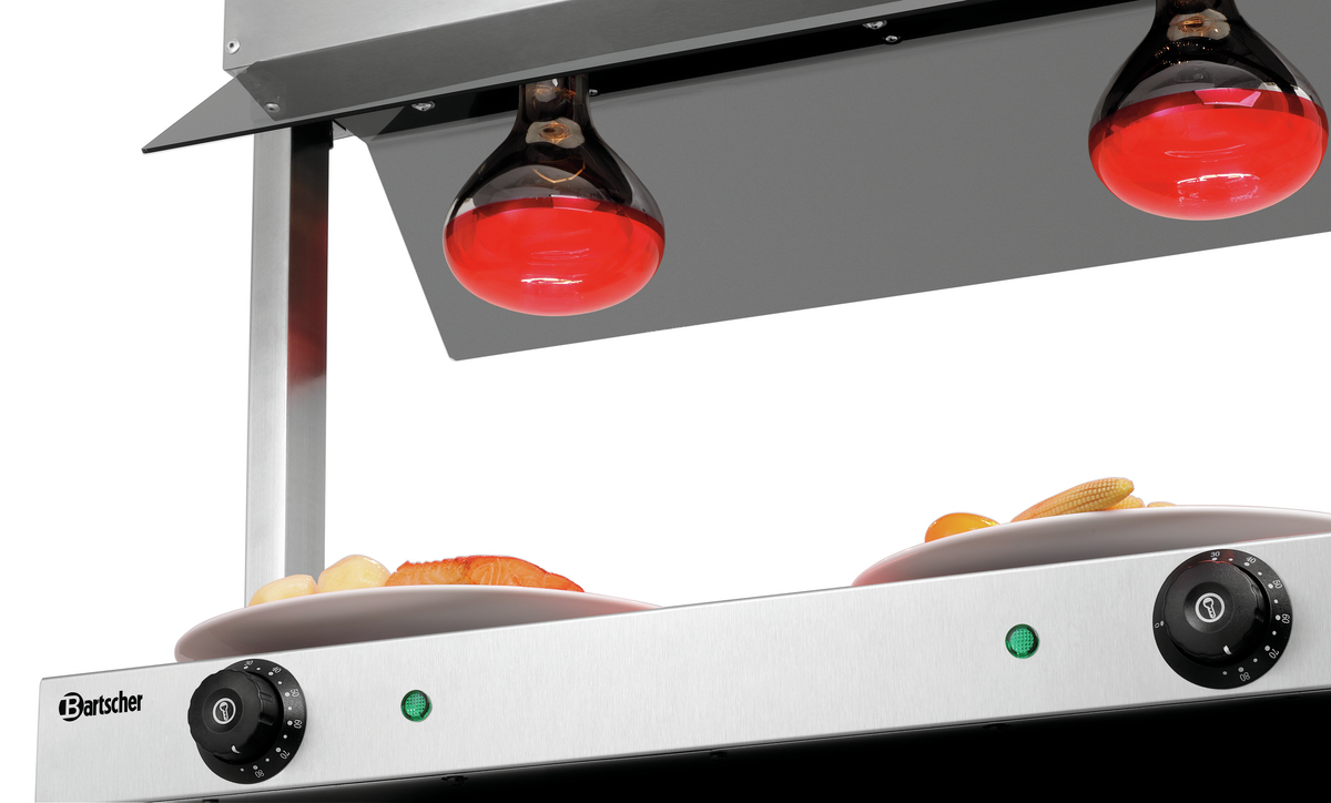 The food warmer is designed to maintain the perfect temperature for GN containers at the buffet or plates at the serving area. This is achieved through the use of two infrared heating lamps positioned above, and a stainless steel warming plate located below, which together transfer heat effectively to the food.