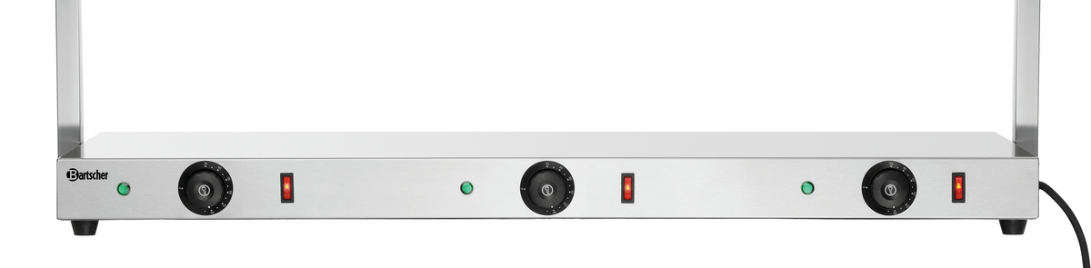 The food warmer is designed to maintain the perfect temperature for GN containers at the buffet or plates in the serving area. This is achieved through the use of three infrared heating lamps positioned above, combined with a stainless steel warming plate below, ensuring efficient heat transfer to the food.