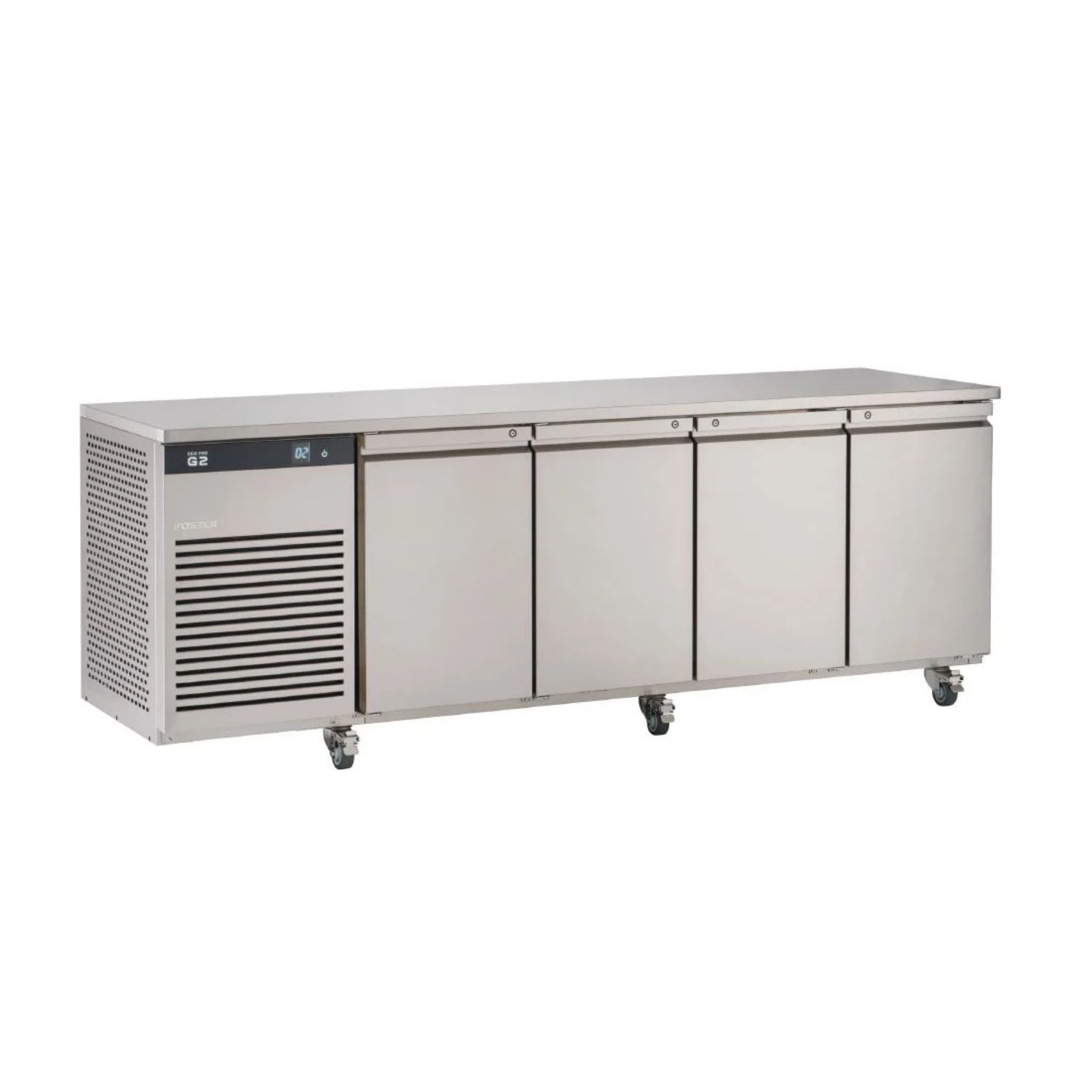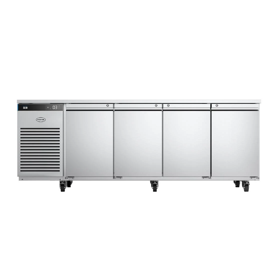 The high-capacity four-door counter from Foster is crafted with durable stainless steel and equipped with robust castors for easy mobility. It features high-quality components, lockable doors, a slide-out refrigeration system, and an easy-clean interior. This counter is ideal for busy kitchens that require a substantial amount of additional refrigerated storage and workspace.